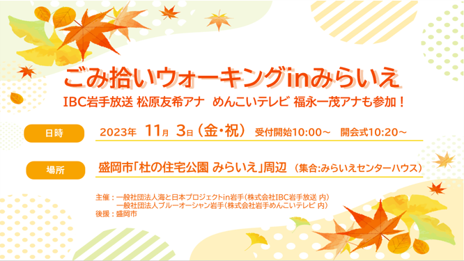岩手のキレイで豊かな海を守り、未来へつなぐため、また岩手の皆さんの健康増進のために「ごみ拾いウォーキングinみらいえ」を岩手県盛岡市「杜の住宅公園 みらいえ」周辺にて開催いたします。