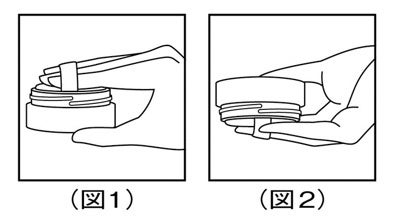●スキンケア後、パフを中フタにのせた状態で、パフが動かないようにしっかりと押さえ(図1)、容器ごと数回ふり、パフに粉を含ませます。(図2)パフを揉むようにしてパフ全体に粉をなじませた後、肌に軽くすべらせるように伸ばし広げます。