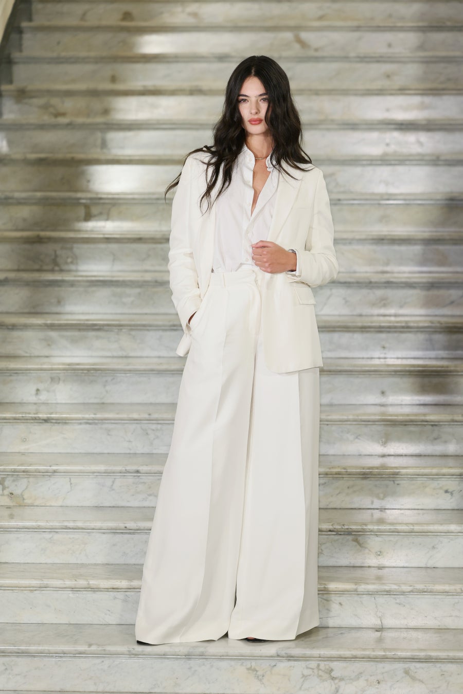 デヴァ・カッセルは、ホワイトウールとシルクのスーツに、ホワイトのコットンシャツを纏いました。