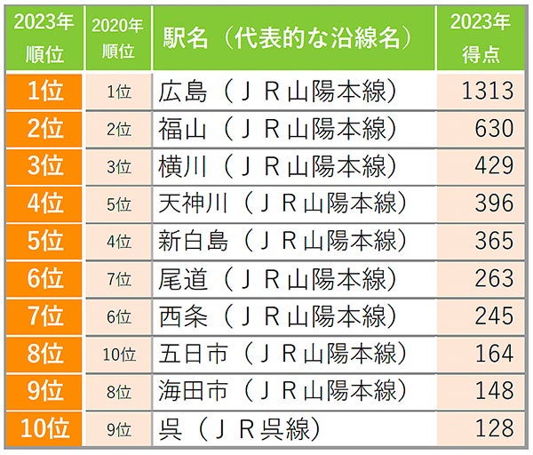 広島県全体、広島市民ともに「広島」が前回に続き連続1位 広島県(駅)ランキングでは「天神川」が5位→4位に、「五日市」が10位→8位にランクイン