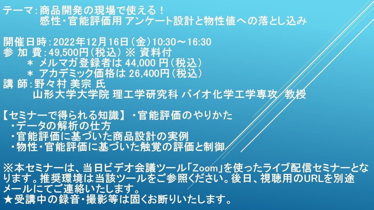 先端技術情報や市場情報を提供している(株)シーエムシー・リサーチ(千代田区神田錦町: https://cmcre.com/ )では、 各種材料・化学品などの市場動向・技術動向のセミナーや書籍発行を行っておりますが、 このたび「商品開発の現場で使える! 感性・官能評価用 アンケート設計と物性値への落とし込み」と題するセミナーを、 講師に野々村 美宗 氏 山形大学大学院 理工学研究科 バイオ化学工学専攻 教授)をお迎えし、2022年12月16日(金)10:30より、 ZOOMを利用したライブ配信で開催いたします。 受講料は、 一般:49,500円(税込)、 弊社メルマガ会員:44,000 円(税込)、 アカデミック価格は26,400 円(税込)となっております(資料付)。