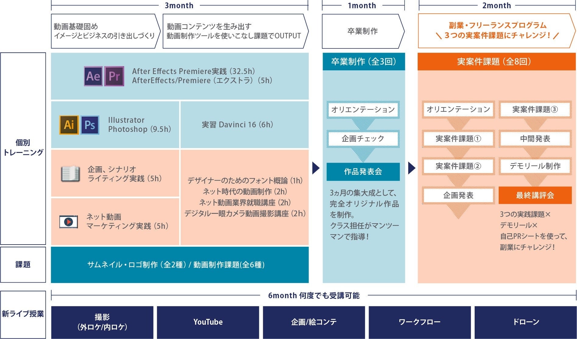 2ヶ月通して、実践課題A「SNS用縦動画」・実践課題B「テーマに沿った企画提案」・クライアントワーク「実際の案件制作」を行い、企画力と実践力を鍛えます。クライアントワーク終了後は案件獲得に必須のデモリールを制作。