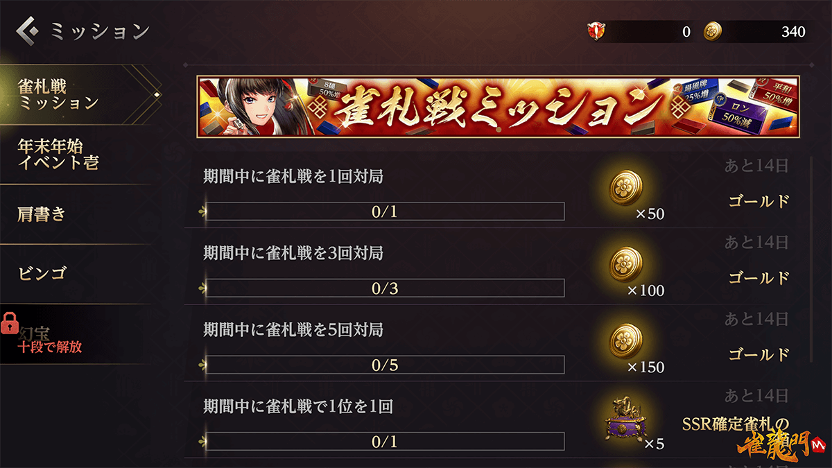 ミッションクリアで、最大300ゴールドやSSRの雀札が必ず手に入る箱が最大15個獲得できます!