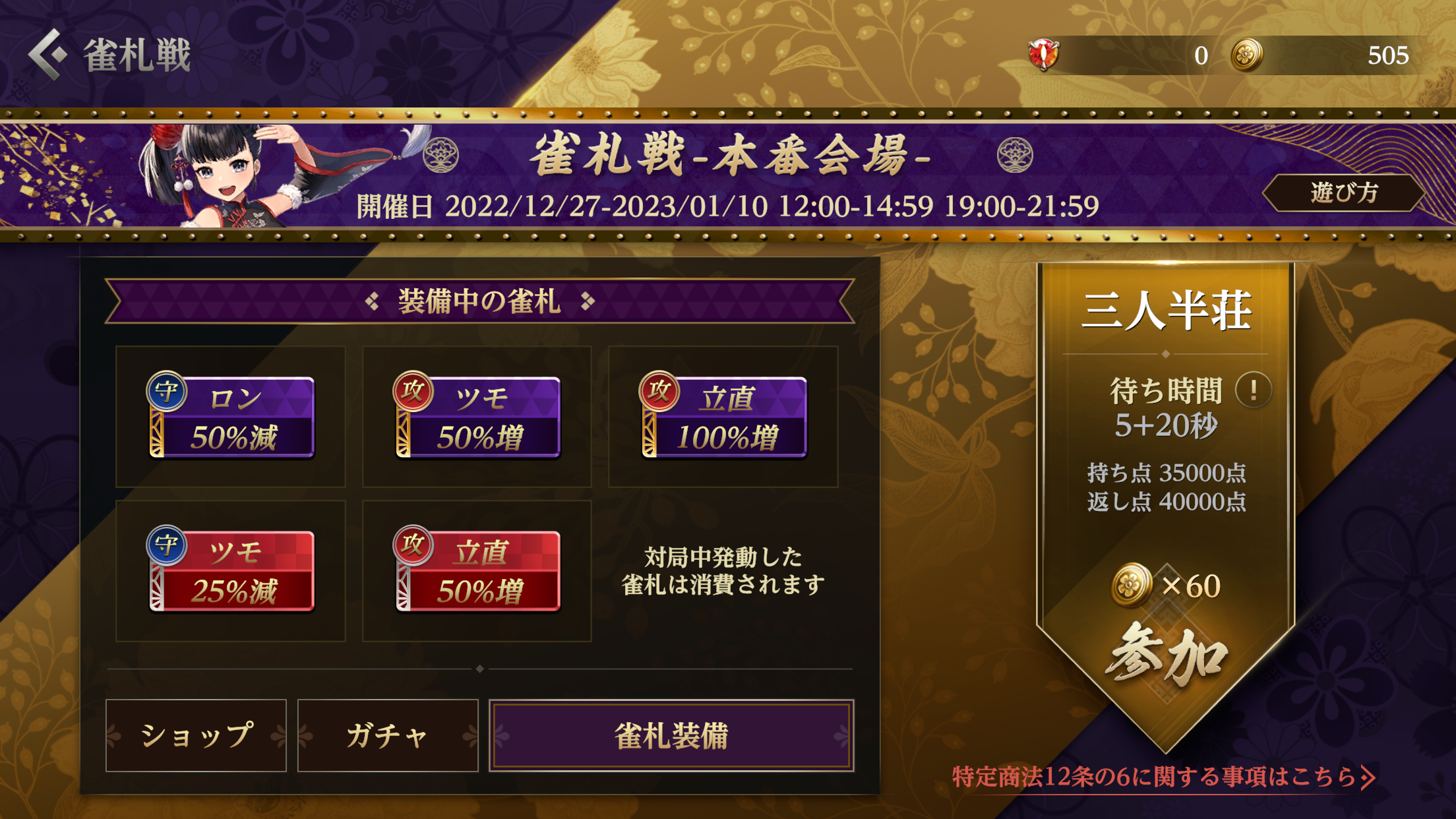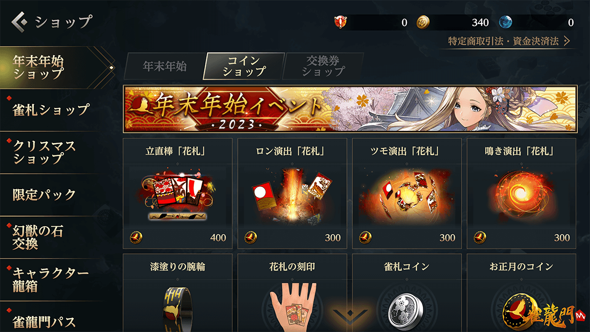 「お正月のコイン」は公式戦(中級卓以上)の対局報酬、イベントミッション報酬、年末年始ショップの商品などから入手が可能です!