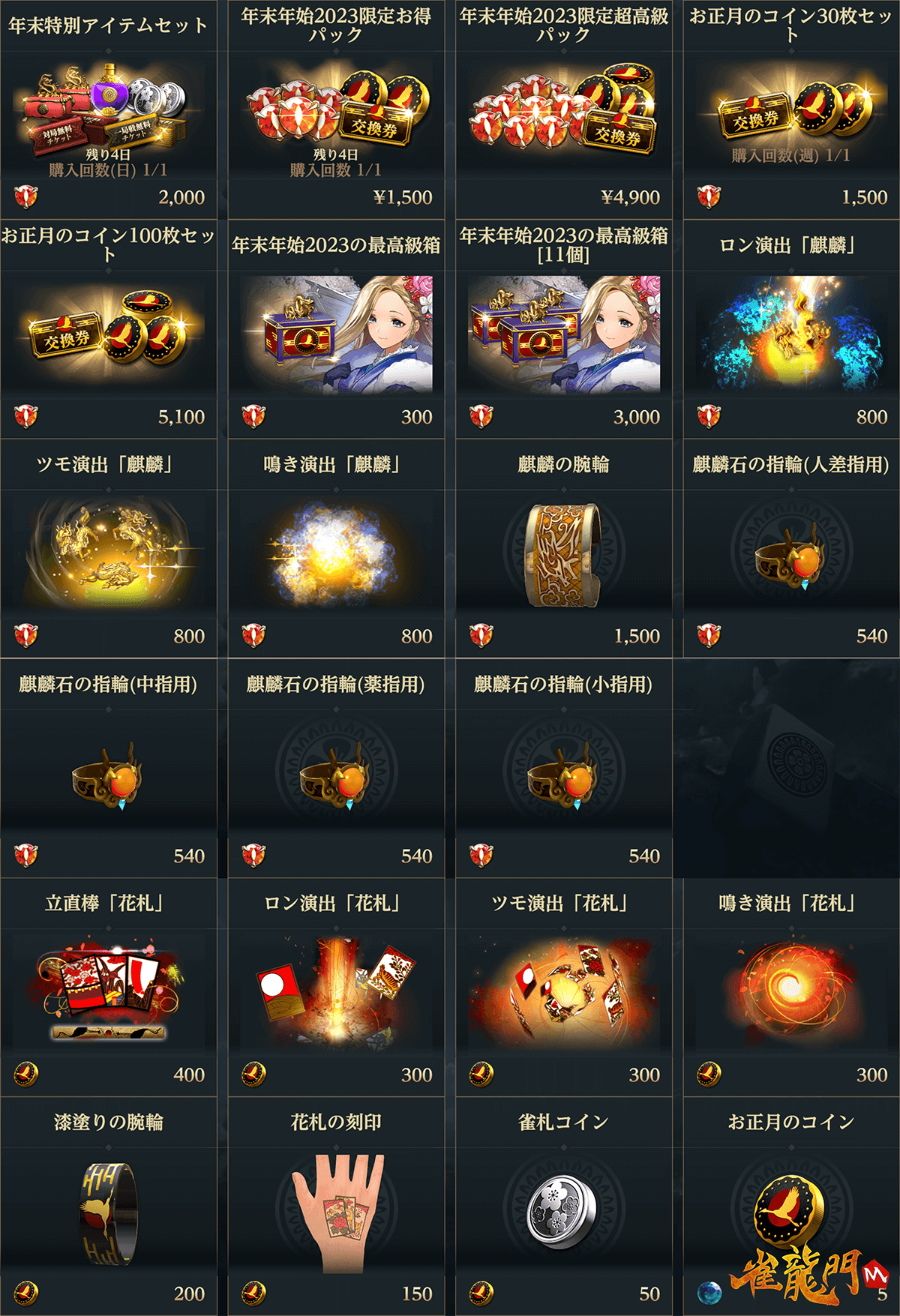 さらに、昨年開催されたイベント「雀龍門M年末年始イベント」のアイテムを購入できる復刻ショップが2023年1月1日より登場します!