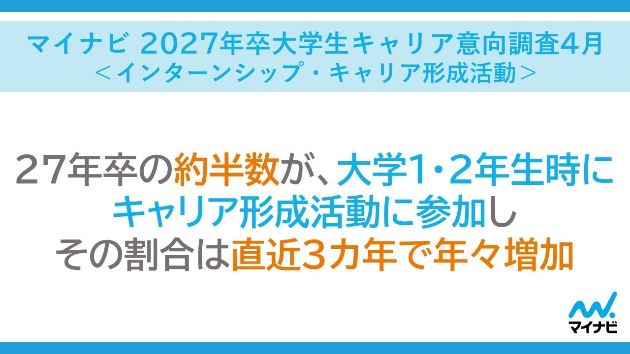 株式会社マイナビ(本社:東京都千代田区、代表取締役 社長執行役員:土屋芳明)は、2027年3月卒業見込みの全国の大学生、大学院生(2,878名)を対象に実施した、「マイナビ 2027年卒大学生キャリア意向調査4月<インターンシップ・キャリア形成活動>」の結果を発表しました。
