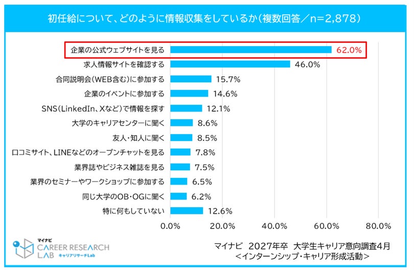 初任給について「企業の公式ウェブサイト」経由で情報収集する学生が6割超