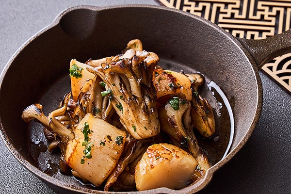 肉厚でしっかりした歯ごたえに、旨み豊かな「福井県産九頭竜まいたけ」と帆立貝を、特製ガーリックバターで香ばしくソテーしました。