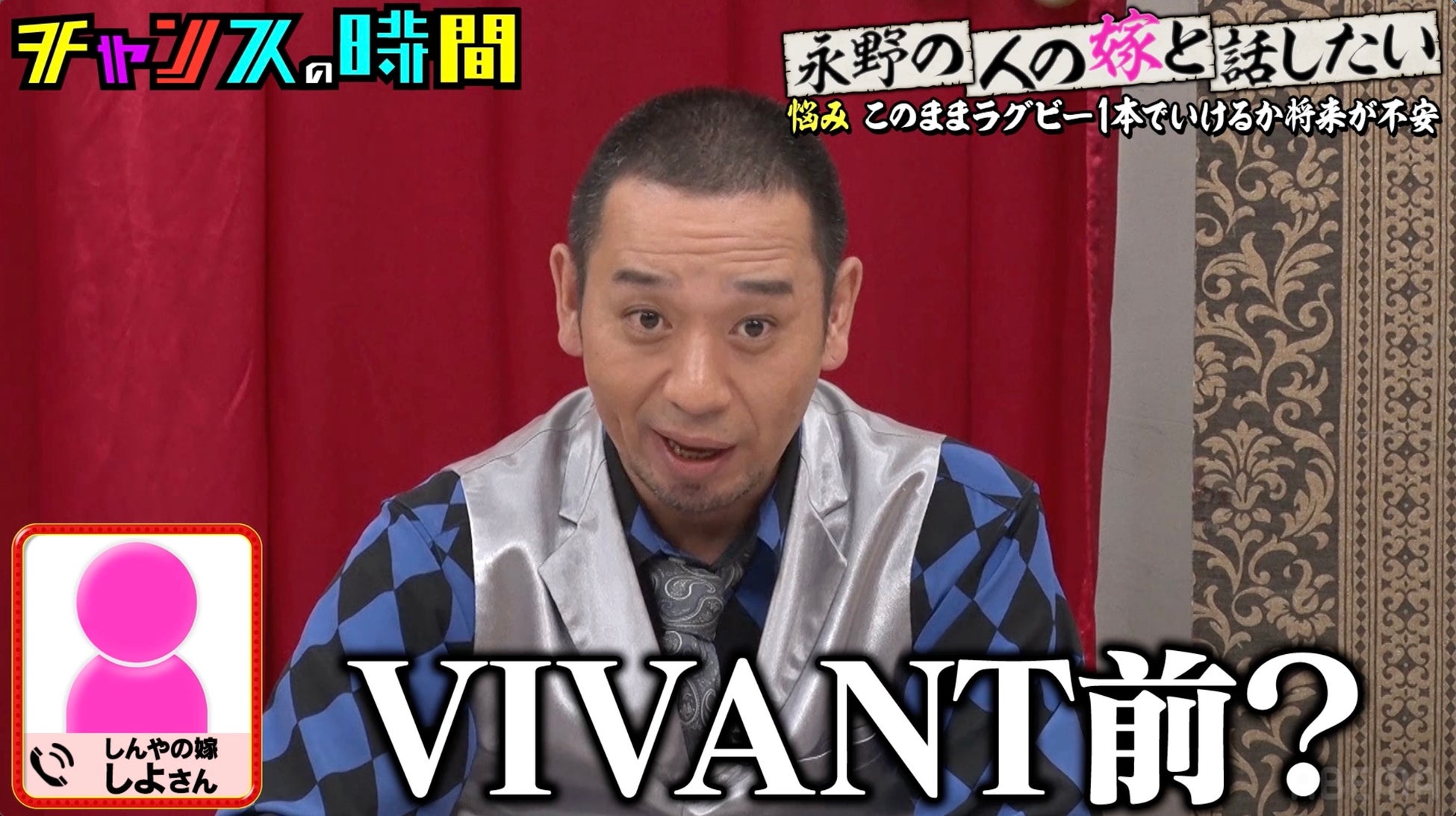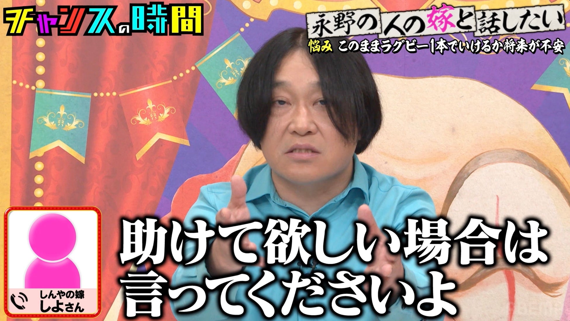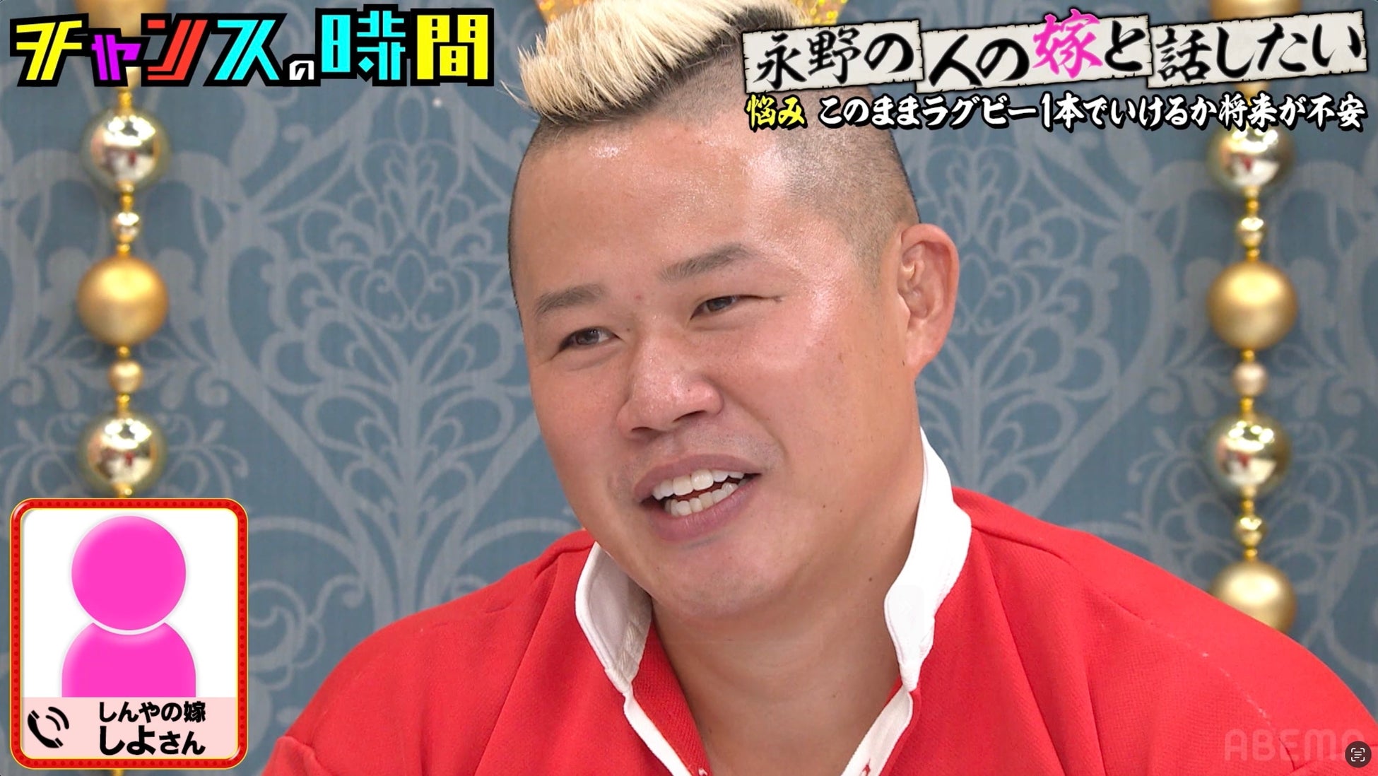 そして、最後には日曜劇場『ノーサイドゲーム』や『VIVANT』への出演経験を持つ、ラグビー芸人・しんやが登場。中学の同級生で交際歴17年、昨年7月に結婚した妻・しよさんは「このままラグビー1本で行けるのか将来が不安」と打ち明けます。永野は「安心してください、しんやは人脈がすごい。一生クローズドパーティーとかでいける」「闇営業ですけど」とズバリ回答します。しかしその後、しよさんの証言でしんやの“裏の顔”が次々判明。しよさんが喋るたびに「しよ!しよ!」と大声で名前を呼ぶしんやに、疑心を抱いた永野が「助けてほしい場合は言ってくださいよ」と心配する場面もありました。そんな中、しよさんから「ゲン担ぎが好きで大事な収録や大きなライブの前日に夜の営みを求められます」と衝撃告白が…!「イヤじゃないですけど」と語ったしよさんから、「『VIVANT』前も…」とさらなる衝撃事実が発覚し、スタジオは爆笑となりました。本放送は、放送後7日間、無料で見逃し視聴が可能です。ぜひ、ご覧ください。