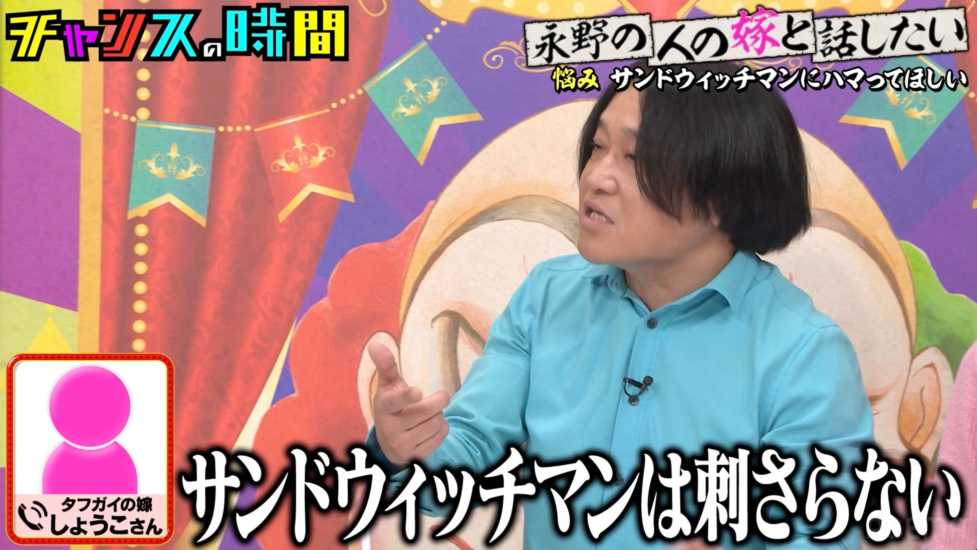 1組目には早稲田大学在学中に出会い、今年5月に結婚した新婚ホヤホヤのタフガイが登場。妻・しょうこさんは「お笑いの方向性を思うとサンドウィッチマンさんにハマってほしい」と打ち明けます。同じ事務所でタフガイとも仲が良いという永野は「高学歴の人には分かんない。本当の悲しい視聴者の気持ち」「本当に孤独な人にサンドウィッチマンは刺さらない」と暴論を展開。さらに、老若男女に届く笑いを目指しているタフガイに「早稲田で出会ったような人には分からない。世の中って裏がある」とした永野は、「明日にも死んでしまうかもしれない人を笑わすのがお笑い」と熱弁。「(ポップな笑いは)3食食える奴向けのコンテンツ」と言い切った永野は、しょうこさんに「タフガイといすぎて平和ボケしてる」と指摘します。その後も続いた永野独自のお笑い論に、しょうこさんは「納得しちゃいました」と返答。千鳥が思わず「良くないって奥さん!」と声を上げる場面もありました。
