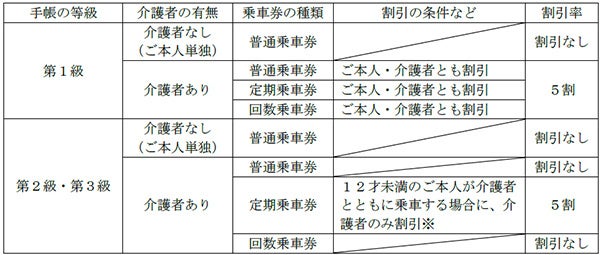 ・ご本人・介護者とも割引を受けることができるのは、同一の種類・乗車区間・有効期間の乗車券を同時にお買い求めいただき、同一の列車に乗車する場合に限ります。