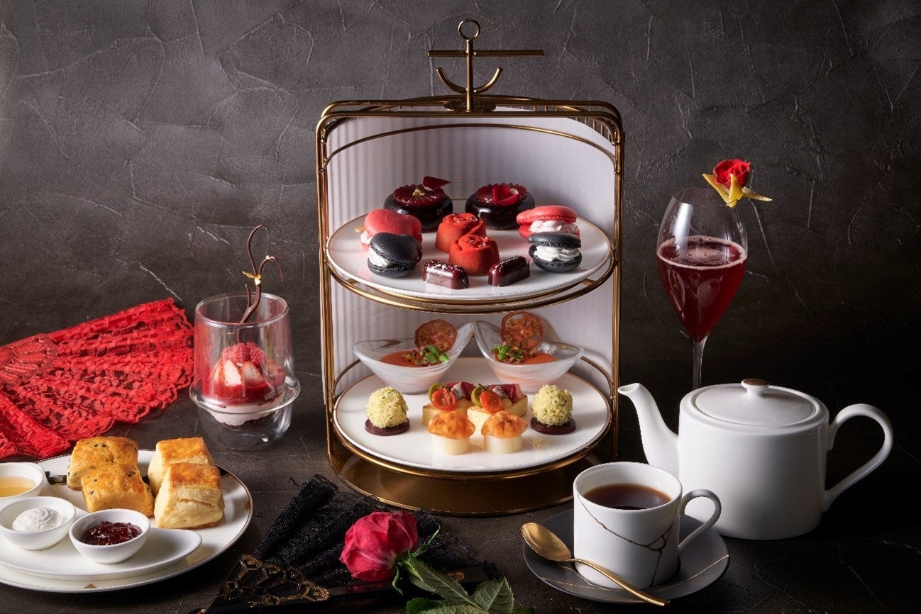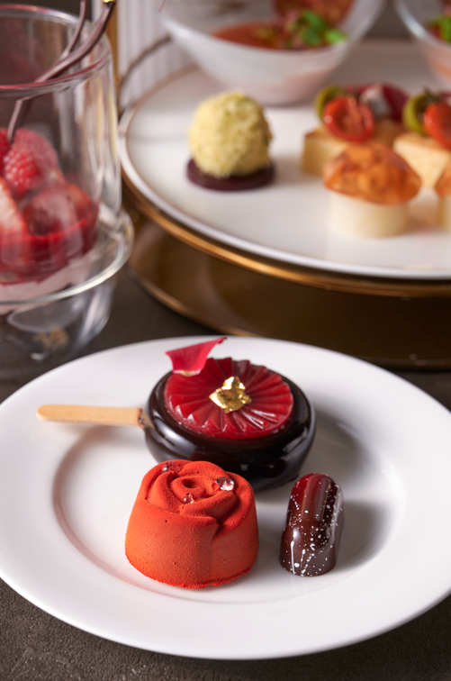 スイーツメニューは「サングリア ショコラ」「竹炭のマカロン」ほか、フラメンコをイメージした赤と黒を基調としたスイーツをご用意。セイボリーメニューは「蛸とポテト スモークパプリカのシート」「湘南トマトのガスパッチョ」などスペインのバル文化を感じられるラインナップです。サングリアをベースにしたウェルカムドリンクとともにご提供いたします。