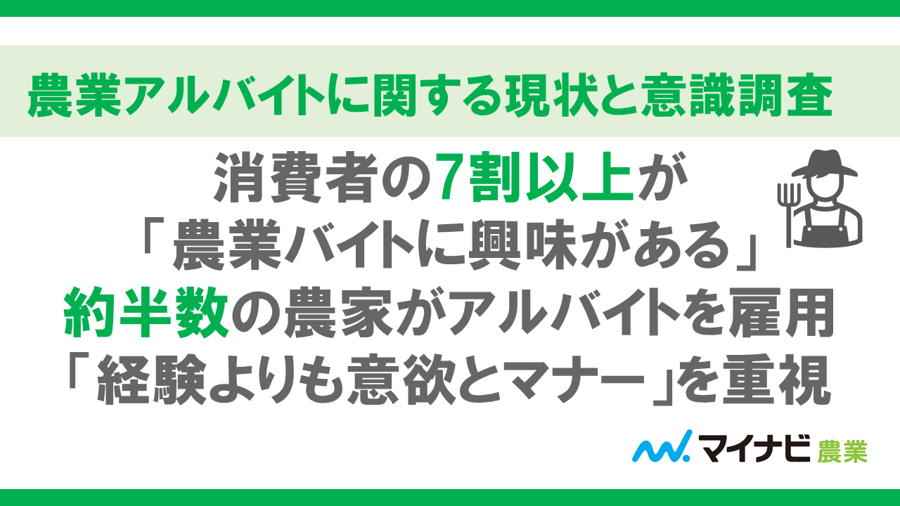 株式会社マイナビ(本社:東京都千代田区、代表取締役 社長執行役員:土屋芳明)が運営する農業総合情報サイト『マイナビ農業』(URL:https://agri.mynavi.jp/)は、「農業アルバイトに関する現状と意識調査」を発表しました。