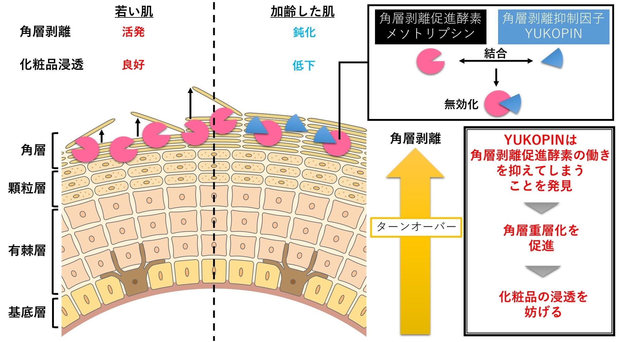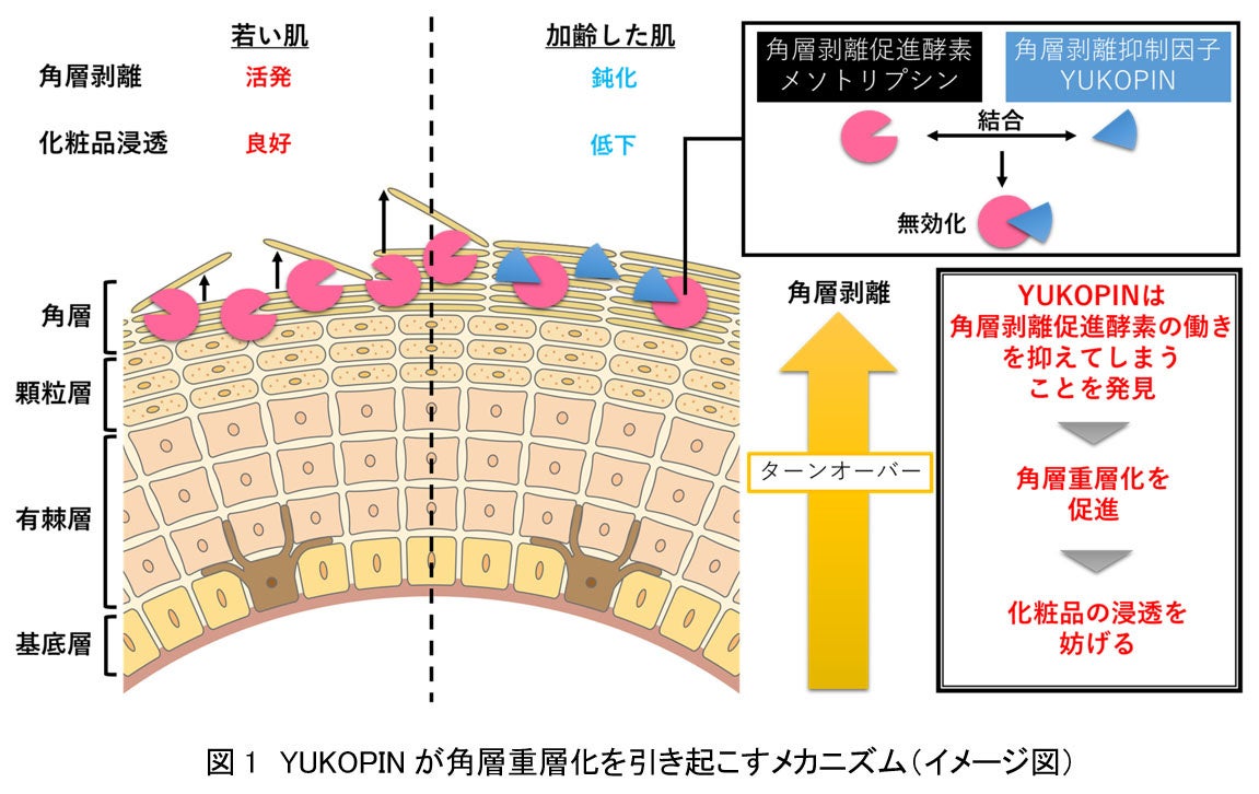 資生堂は、50年以上にわたり続けてきた角層研究から、今回新たに、正常な角層構築・機能維持に「SERPIN B12(別名:YUKOPIN)(以下、YUKOPIN)」が関与していることを発見しました。本研究において、YUKOPINが肌のターンオーバーを促す酵素メソトリプシンの働きを阻害することで、角層の重層化を促進することを明らかにしたことに加え、YUKOPINの発現を抑制する薬剤を見出すことに成功しました。さらに、加齢に伴い角層が重層化した肌では、グリセリンやトラネキサム酸などのスキンケア成分の浸透が妨げられることを確認しました。つまり、YUKOPINに着目したアプローチを行うことで、角層を健やかに保ち、日々のお手入れの効果が高まることが期待されます。