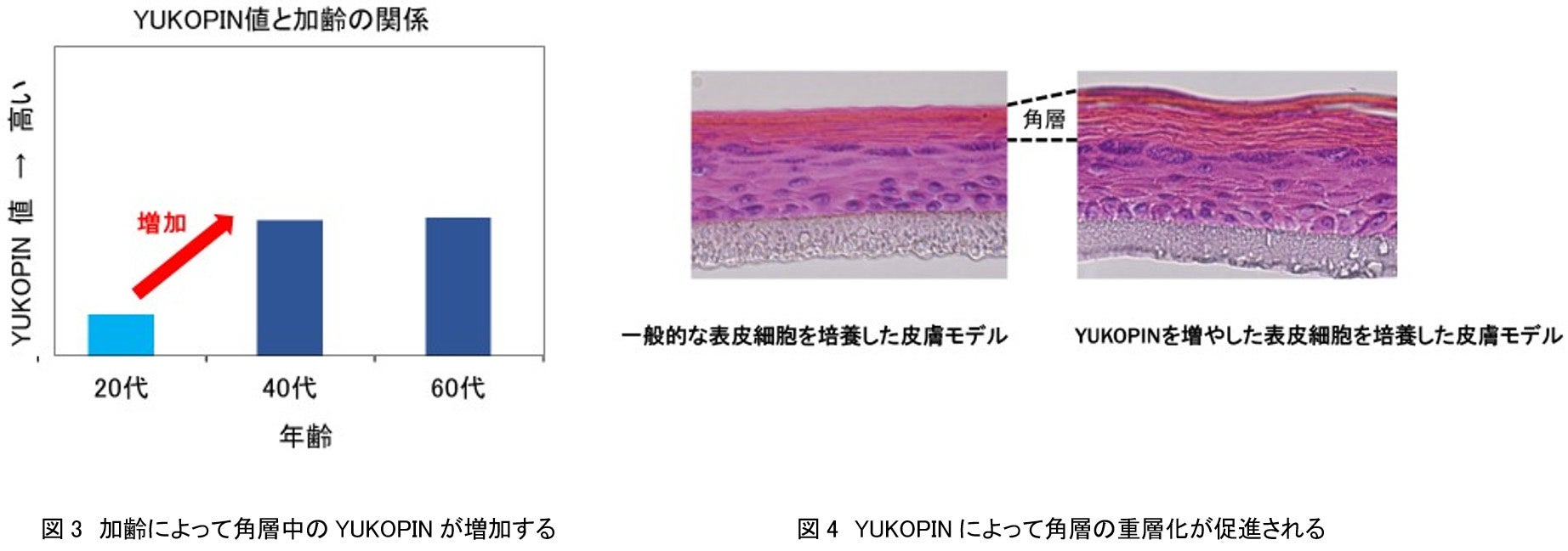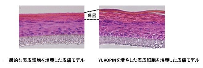今回、年代別の皮膚組織を分析することで、加齢により角層中でYUKOPINというタンパク質が増加することを発見しました(図3)。また、YUKOPINの発現を高めた皮膚培養モデルでは、角層が重層化することが明らかになり(図4)、YUKOPINは角層剥離を抑制する機能を有することを見出しました。さらに生化学的実験から、角層剥離を促進し、その機能が加齢により低下することが確認されている酵素メソトリプシンの活性に対して、YUKOPINが生体内で抑制的に働く因子であることを初めて明らかにしました。すなわち、年齢に伴う角層の重層化のメカニズムの一端は、メソトリプシンとYUKOPINのバランスの乱れによるものであることを発見しました。