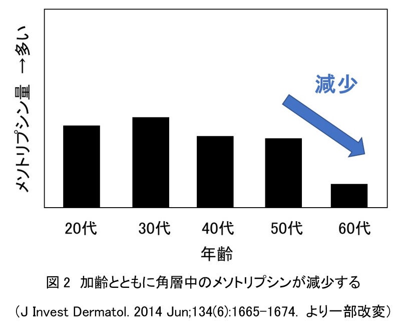 一方、加齢に伴い、角層剥離とターンオーバーは起こりにくくなり、角層が重層化することは知られていましたが、その原因は十分には解明されていませんでした。そこで、当社では研究を進め、角層剥離とターンオーバーを促進する酵素であるメソトリプシンが年齢とともに減少することを見出し(図2)、さらにその詳しいメカニズムに迫るべく、研究を続けました。