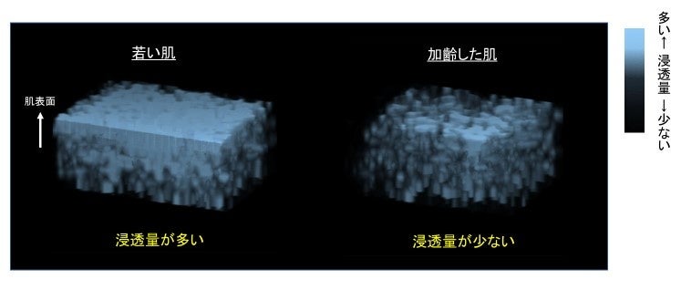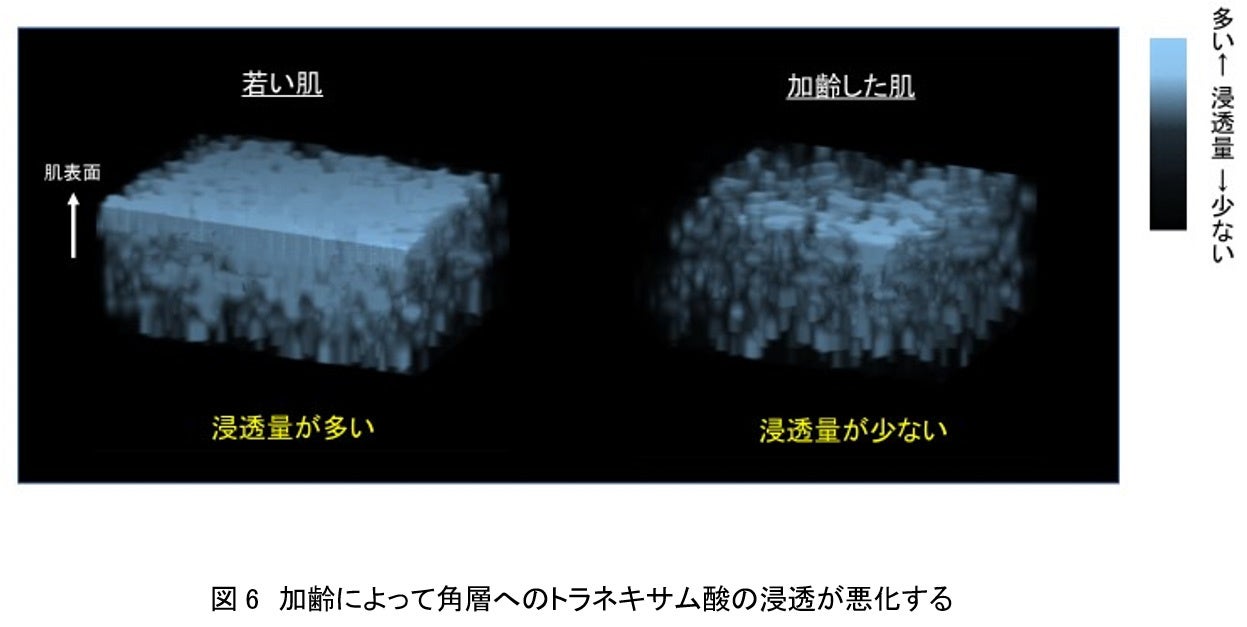 角層重層化による肌への影響を調べるために、ヒトの皮膚にグリセリンやトラネキサム酸が含まれる化粧水を塗布し、角層中のグリセリン、トラネキサム酸の量をLCMS※2 及びDESI MSI※3 で定量・可視化しました。結果、角層が重層化している加齢した肌では、若い肌に比べて成分の浸透量が少ないことを確認することができました(図6)。