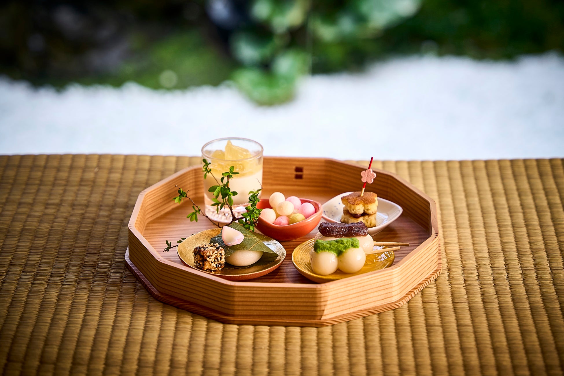 「大阪の豊かな食文化」をテーマに厳選素材にこだわり、寿司、炭火焼、会席、鉄板焼き、天ぷらのお料理をお楽しみいただける日本料理 「花筐」。日本料理の職人が手掛ける香り高い柏餅や、季節ごとの餡をあしらった串団子などのスイーツから、彩り豊かな「手まり寿司」や、旬の食材を取り入れた「魚介と野菜の小鉢」などの本格的なセイヴォリーまで、「花筐」ならではの味わいをお楽しみいただける12種類のラインナップです。お飲み物は、スパークリングワインに加え、冷煎茶、ほうじ茶、抹茶など、和のアフタヌーンティーにふさわしい豊かな味わいをご提供いたします。