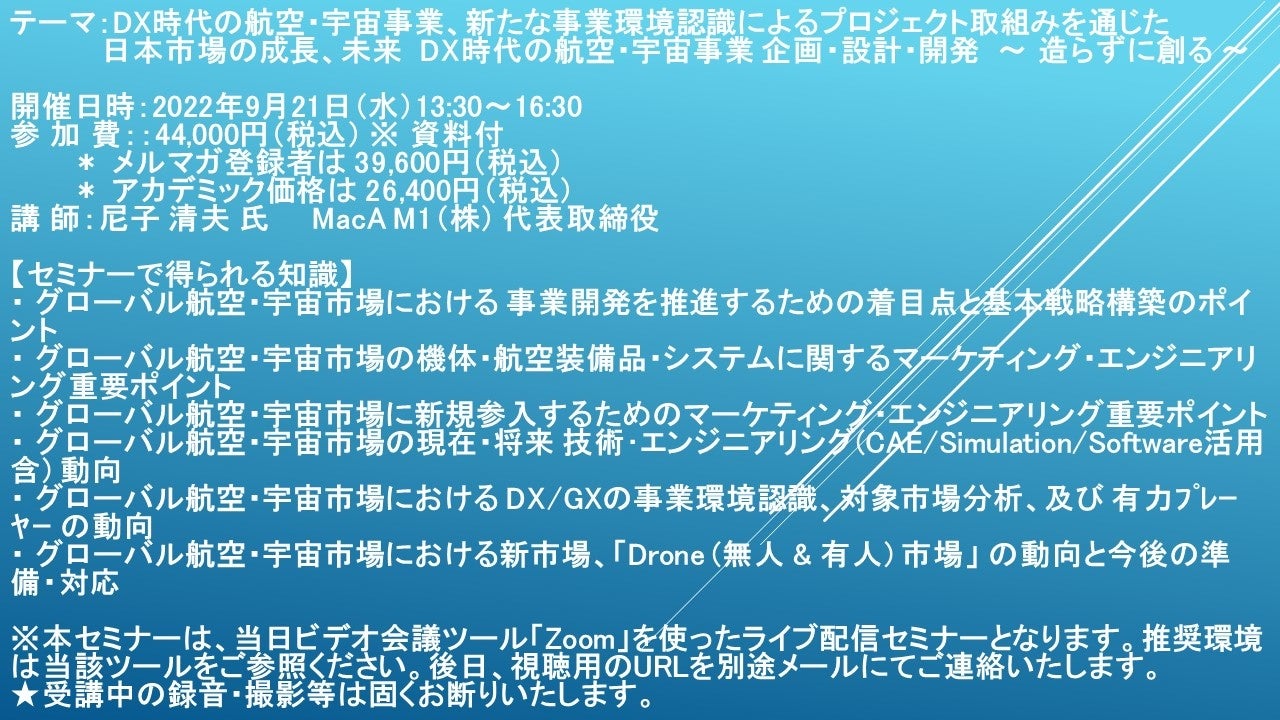 先端技術情報や市場情報を提供している(株)シーエムシー・リサーチ(千代田区神田錦町: https://cmcre.com/ )では、 各種材料・化学品などの市場動向・技術動向のセミナーや書籍発行を行っておりますが、 このたび「DX時代の航空・宇宙事業、新たな事業環境認識によるプロジェクト取組みを通じた日本市場の成長、未来」と題するセミナーを、 講師に尼子 清夫 氏 MacA M1(株) 代表取締役)をお迎えし、2022年12月20日(火)13:30より、 ZOOMを利用したライブ配信で開催いたします。 受講料は、 一般:44,000円(税込)、 弊社メルマガ会員:39,600円(税込)、 アカデミック価格は26,400円(税込)となっております(資料付)。