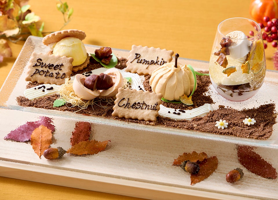 「実りの収穫プロムナード」は、“秋の味覚の収穫”をテーマに、芋・栗・南瓜それぞれの味わいをじっくり愉しめるエリアと、3つの味覚が重なり合うパフェで構成された、ストーリー性あふれる一皿です。なめらかなかぼちゃのチーズケーキや香ばしいさつまいものブリュレなど、深まる秋の実りを愛でるティータイムをお愉しみください。