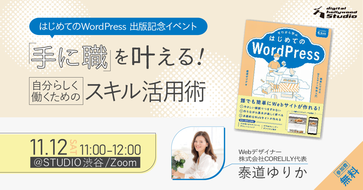 IT関連及びデジタルコンテンツの人材育成スクール、デジタルハリウッド(運営会社:デジタルハリウッド株式会社 本社/本校:東京都千代田区 学長:杉山知之)が運営をする、新しい学びのスタイルを通して多様なライフスタイルを支援し全国へ展開している、Webと動画について学べるラーニングスタジオ『デジタルハリウッドSTUDIO』では、卒業生・泰道ゆりかさん2冊目の著書『はじめてのWordPress』の出版を記念したイベントを11月12日(土)に開催します。