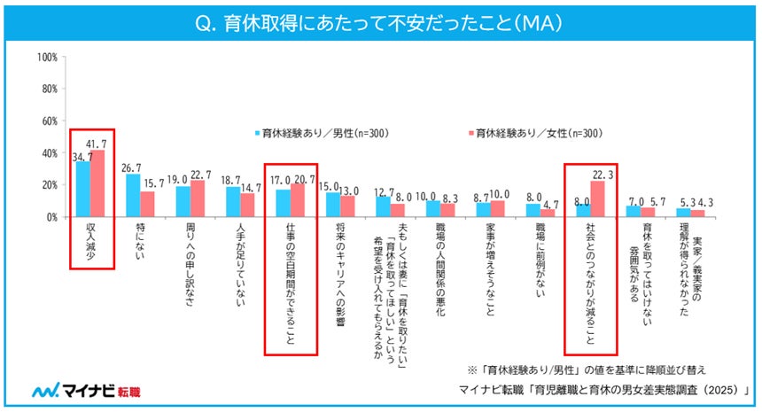 ◆育休取得で不安なこと1位は「収入減少」。女性では「社会とのつながりが減ること」「仕事の空白期間ができること」も高い