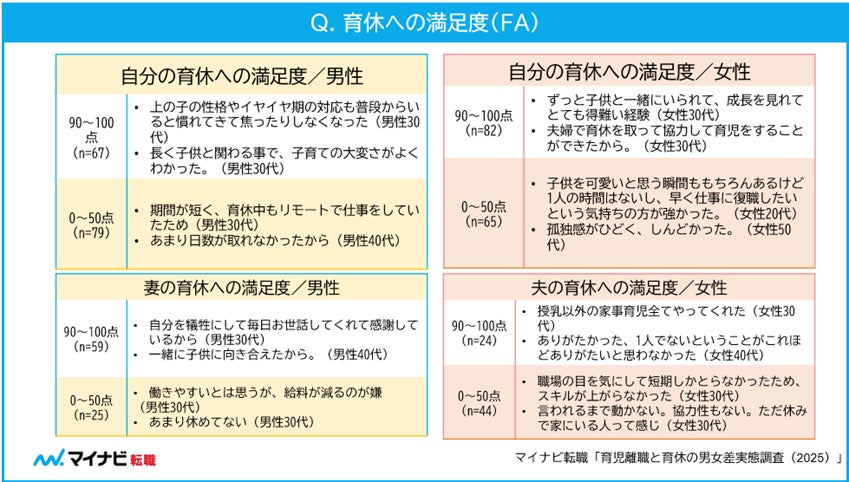 育休に満足した理由では、「子どもの成長を間近で感じられた」「家族で協力して育児に向き合えた」という回答があがった。目の前の子育てだけでなく、今後十数年続く子育てを夫婦で一緒に乗り越えていけるという信頼感や安心感を得られたといった回答もみられた。