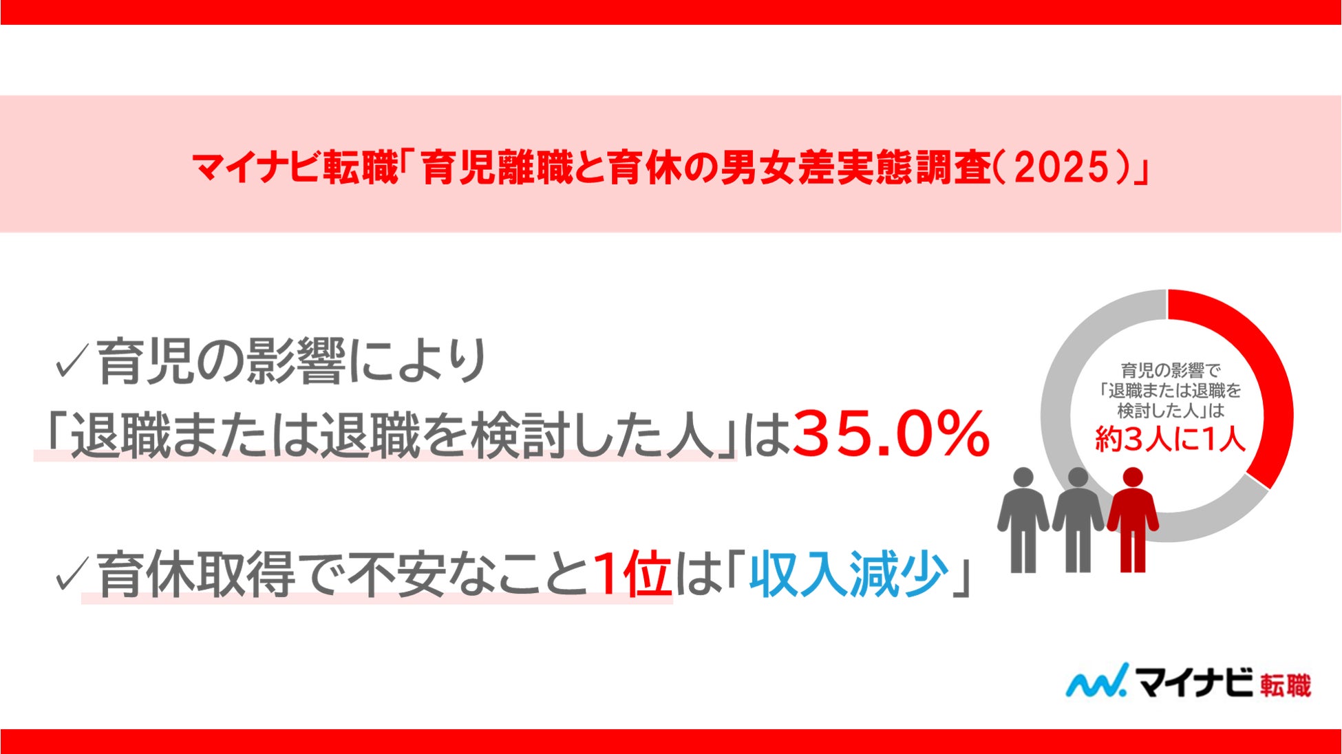 株式会社マイナビ(本社:東京都千代田区、代表取締役 社長執行役員:土屋芳明)が運営する総合転職情報サイト『マイナビ転職』(https://tenshoku.mynavi.jp/)は、800名の子育て中の正社員を対象に行った「育児離職と育休の男女差実態調査(2025)」の結果を発表しました。本調査では、育児と仕事の両立に悩む社員の姿や、育児中のキャリアに関する男女の意識差、育休取得のハードルなどが明らかになりました。