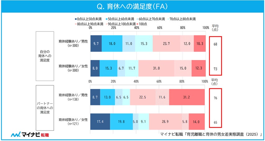 ◆自身の育休への満足度は男性68点、女性73点。パートナーの育休への満足度は男性76点、女性65点。満足の理由は「大変な子育てを共に乗り越えられたこと」