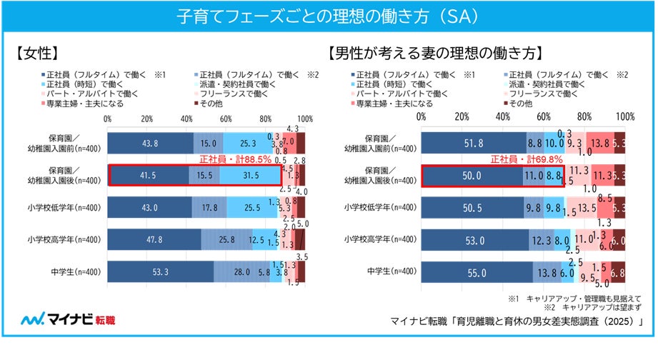 ◆子どもの保育園入園後、正社員としてのキャリア継続を理想とする女性は約9割。一方、妻の正社員キャリアを理想とする男性は約7割に留まり、夫婦間の理想では一定数のギャップがみられた