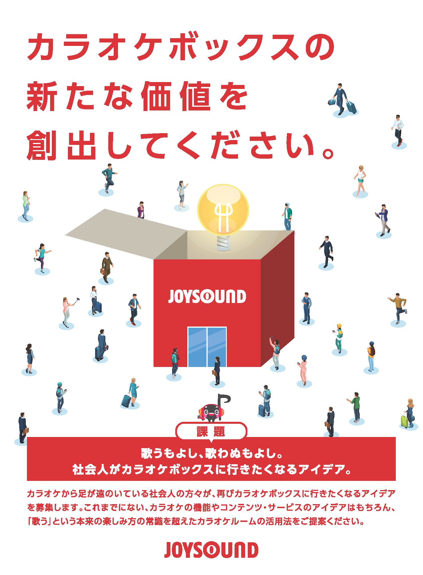 長引くコロナ禍を背景に苦境に立たされてきたカラオケ業界。現在は、客足も戻り始め、市場回復に向けた明るい兆しも見え始めている一方、忘新年会の2次会での利用など、大人数での宴会需要がコロナ前の水準まで回復するには時間がかかるとみられています。このような状況下、カラオケから足が遠のいている社会人の方々の「カラオケボックスに行きたい」という気持ちを再び想起させ、市場全体の活性化を目指すべく、カラオケボックスへの新たな来店動機となり、来店者を増加させることができる、カラオケの新たな価値を創出するアイデア募集するに至りました。
