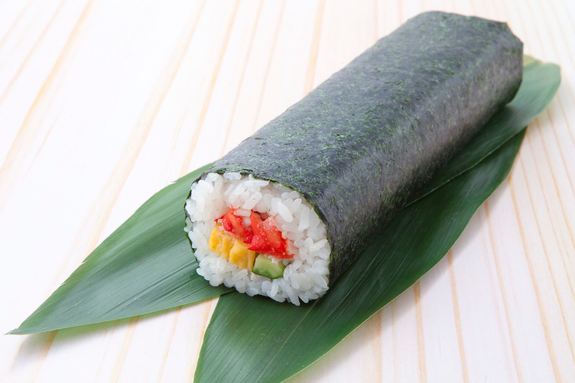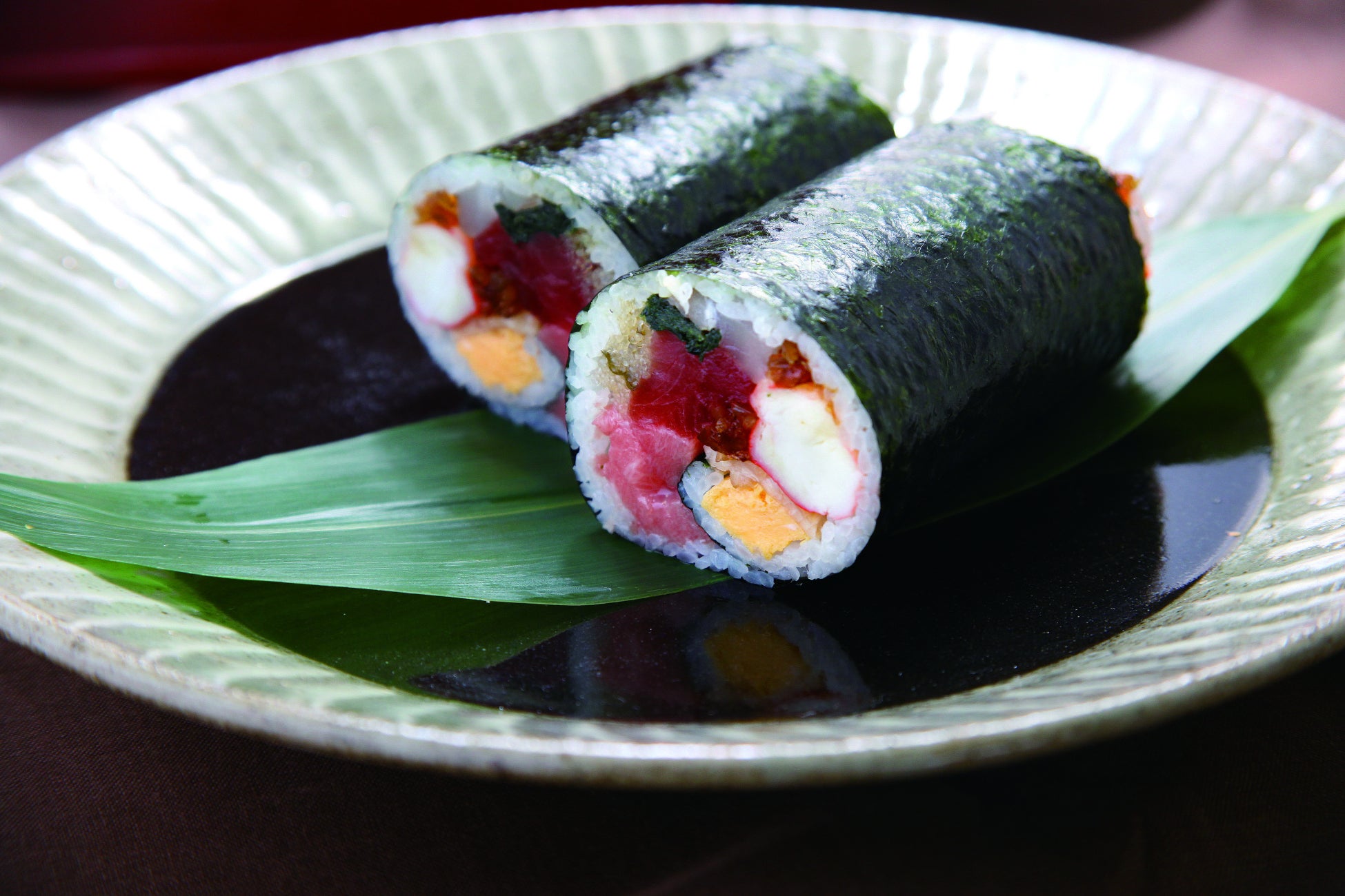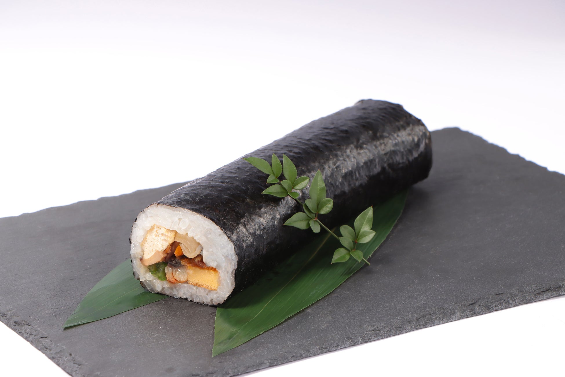 しいたけ、厚焼き玉子、荒野豆腐、穴子、おぼろカニカマ、キュウリ、大葉、キクラゲなど14種類たっぷり具材の入った恵方巻。