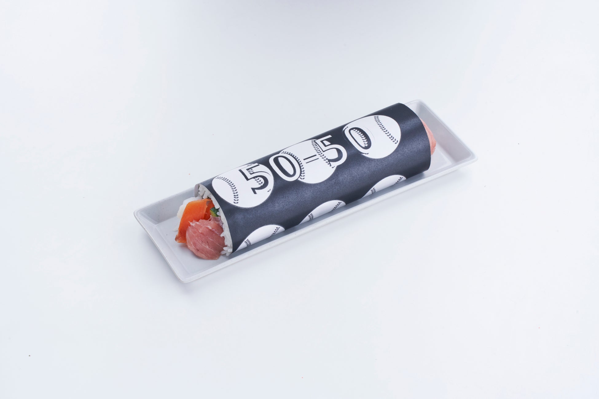 今年話題の50-50をあしらった海苔に、国産生本鮪中トロ、真鯛、サーモントラウト、イカ、エビ、とびこ、きゅうりを巻き込んだ、海鮮恵方巻。
