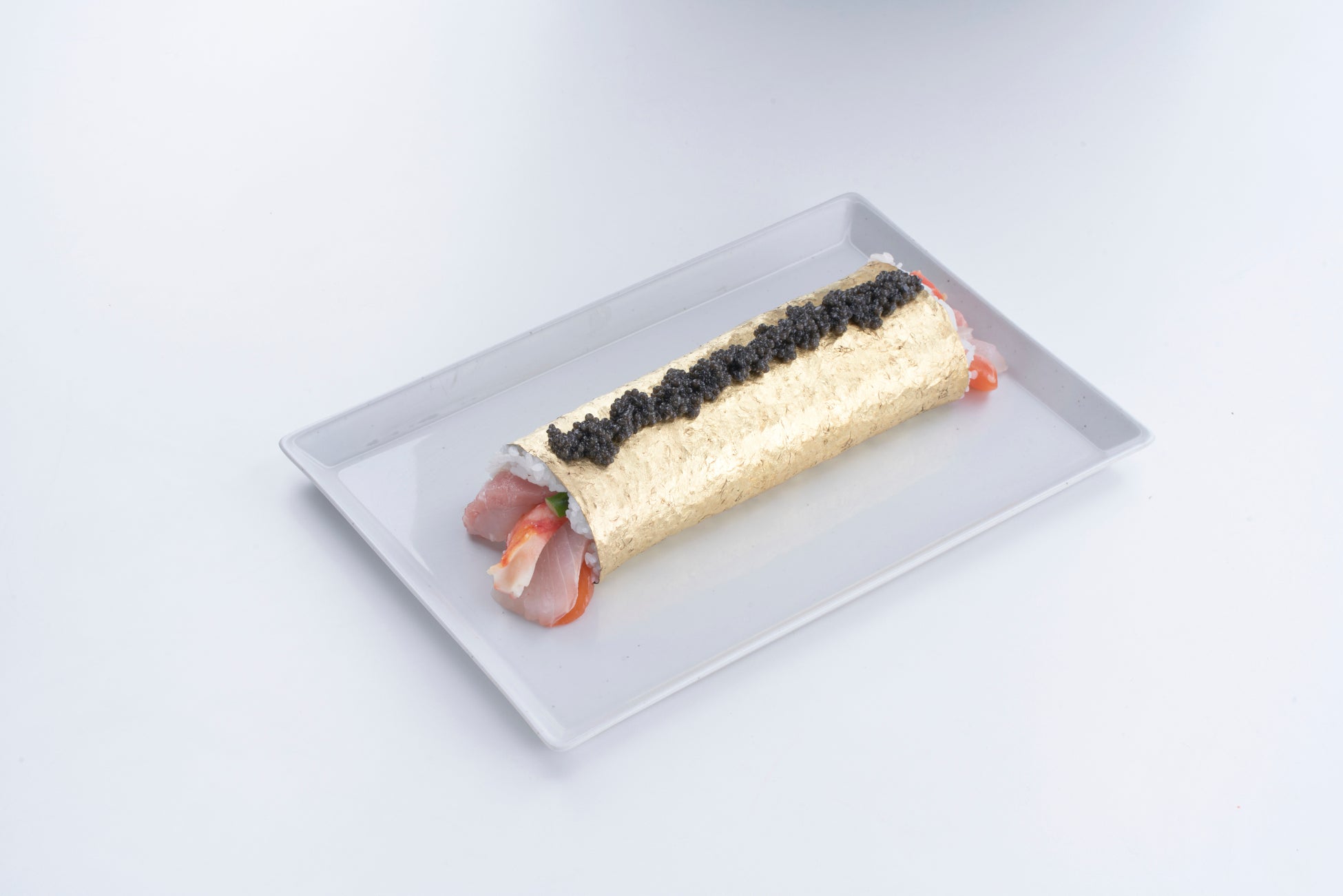 でました!毎年大人気の金箔海苔で巻いた恵方巻。国産生本鮪中トロ、国産とらふぐ、ズワイガニ、国産生サーモン、イカ、国産イクラ醤油漬け、きゅうりの具にキャビアを添えてより贅沢に。