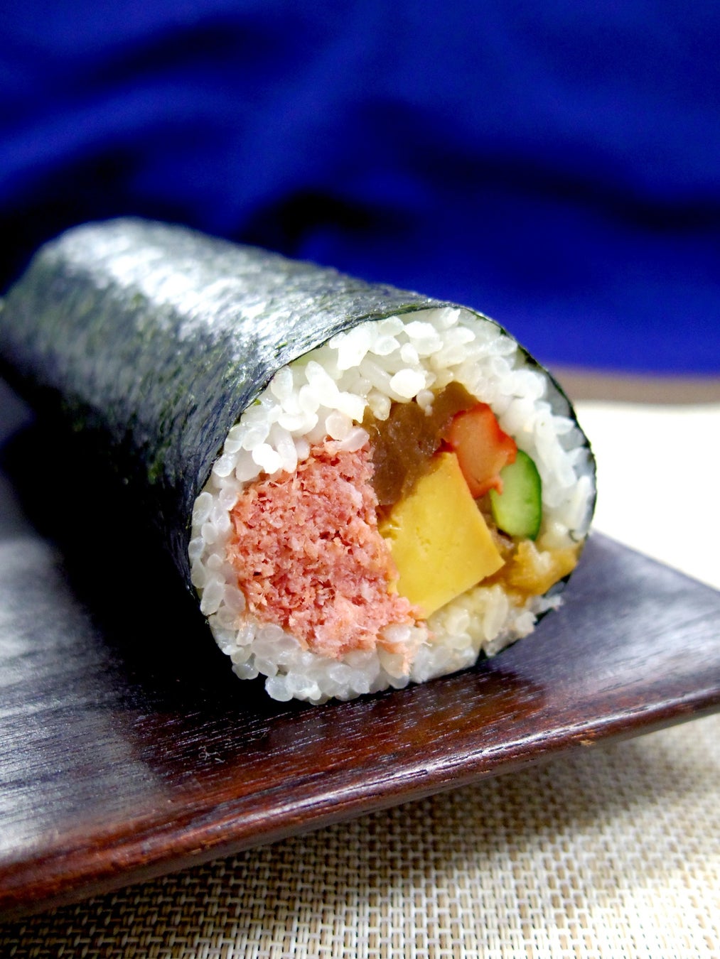 中トロ、ズワイガニ、たまご、椎茸にイクラ、数の子、サーモン、エビ、とびっこ、きゅうり、かんぴょうを50‐50にちなんで高菜と海苔の2種で巻きました。