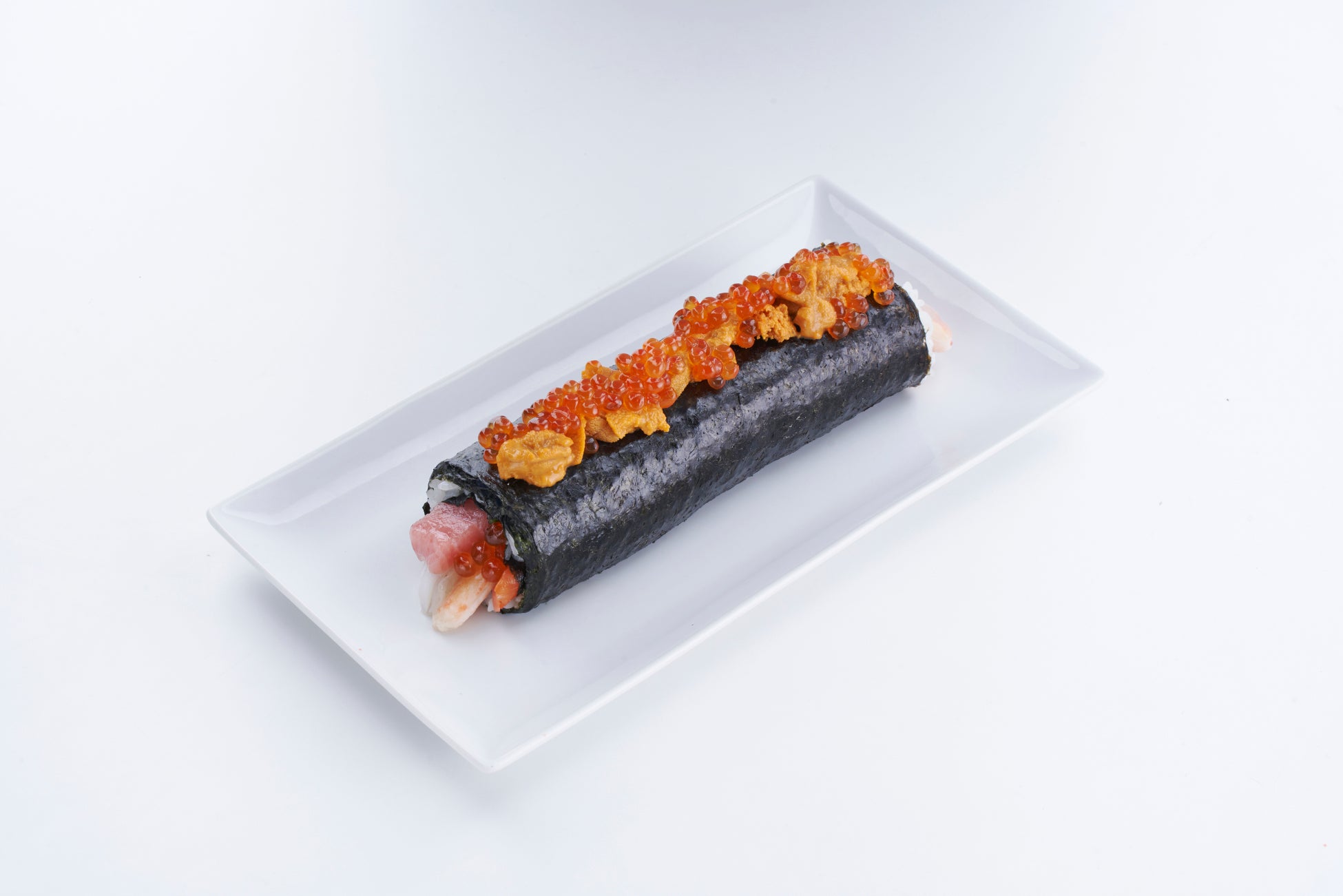 【S】国産生サーモン、【H】国産とらふぐ、【O】国産生本鮪大トロ、【G】タラバガニ、【U】ウニ、【N】のどぐろ、きゅうり、国産イクラ醤油漬け6種類の具がはいった豪華恵方巻。別添えのうにといくらをお好みでトッピング。