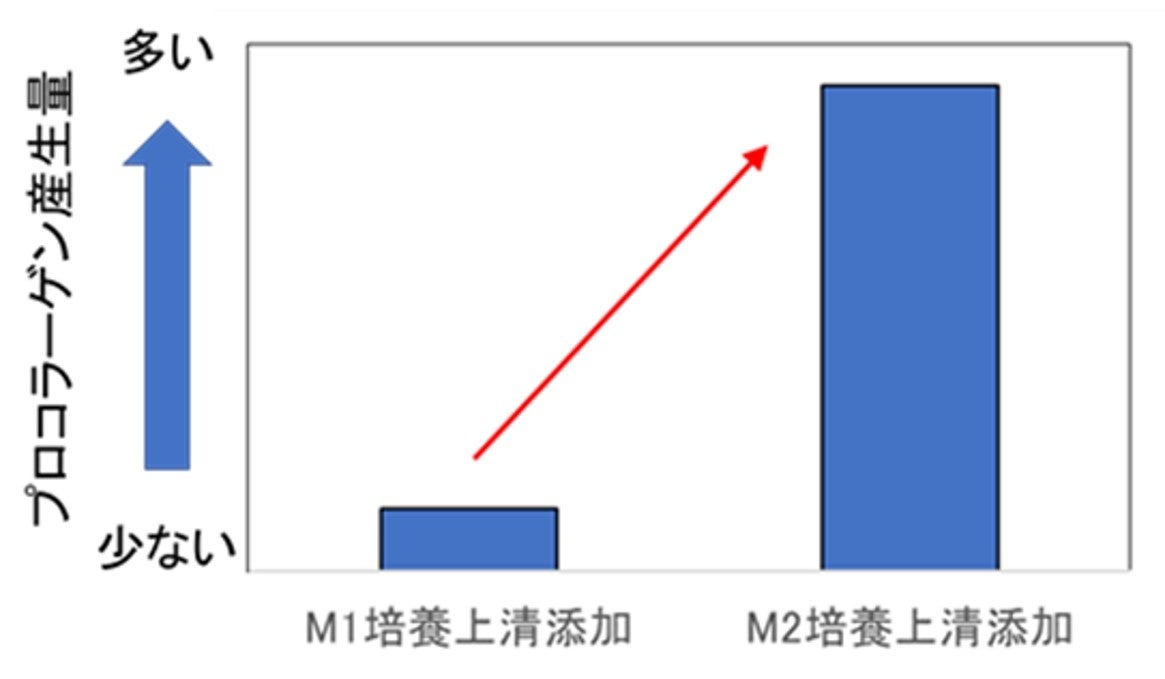M1/M2バランスは、皮膚の傷が治る過程(創傷治癒)におけるコラーゲン代謝のコントロールに重要であることが近年報告されています。そこで、M1、M2マクロファージが線維芽細胞によるコラーゲンの産生と分解に与える影響について検証しました。その結果、皮膚組織において、M1/M2バランスとコラーゲン発現に相関関係が確認されました。また、M1マクロファージの培養上清※5 を線維芽細胞に添加した場合に、コラーゲン産生抑制・分解促進が起こることでコラーゲン線維が顕著に減少することが明らかになりました(図1)。加えて、M2マクロファージの培養上清を添加した場合には、M1マクロファージの培養上清を添加した時と比較してコラーゲンの前駆体であるプロコラーゲンを指標にした評価でコラーゲン産生が促進されることが分かりました(図2)。