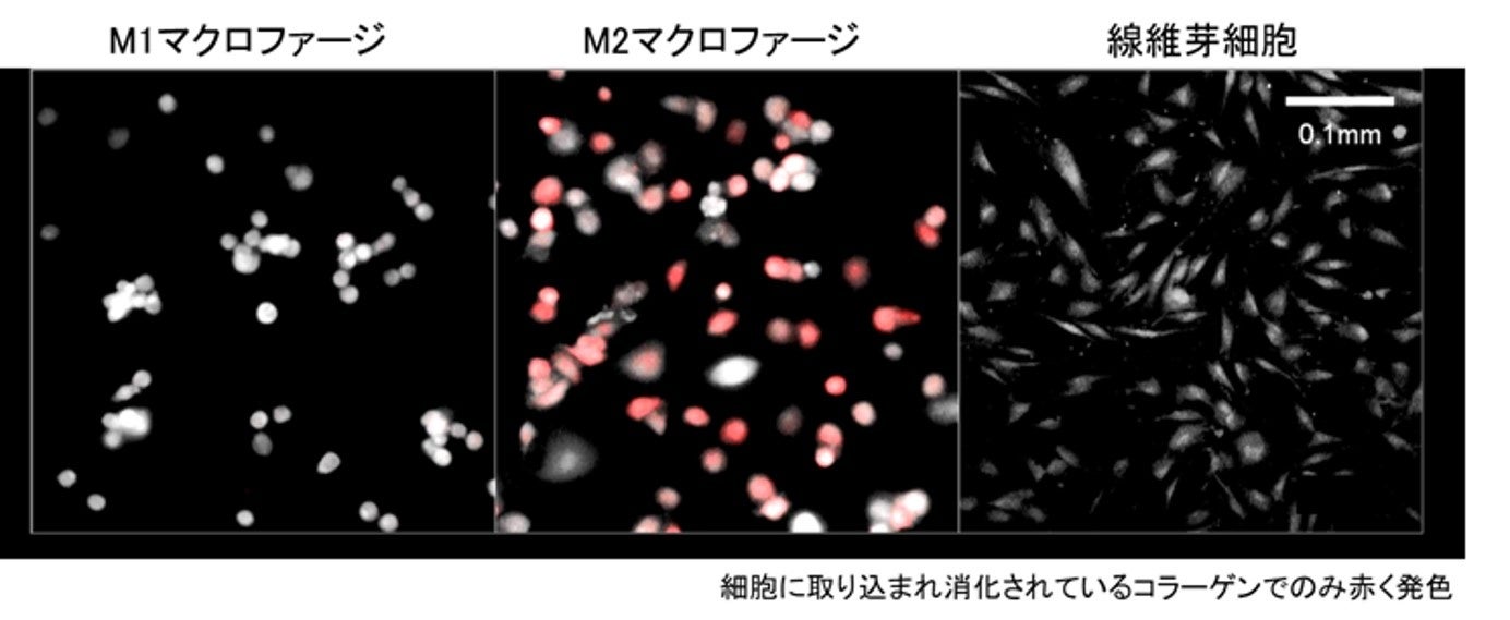 次に、マクロファージに特徴的な生体内物質を取り込み消化・除去する機能と、皮膚のコラーゲン代謝との関わりを明らかにする目的で、M1、M2マクロファージおよび線維芽細胞が変性コラーゲン※6 を消化する能力について検証しました。その結果、M2マクロファージが顕著に変性コラーゲンを取り込み消化・除去していることが分かりました(図3)。線維芽細胞は、本来の健全な立体構造をもったコラーゲンと結合している方がより多くのコラーゲンを産生することが知られています。M2マクロファージによって変性コラーゲンが適切に除去されることで、よりコラーゲンが産生されやすい環境が作り出されている可能性が示されました。