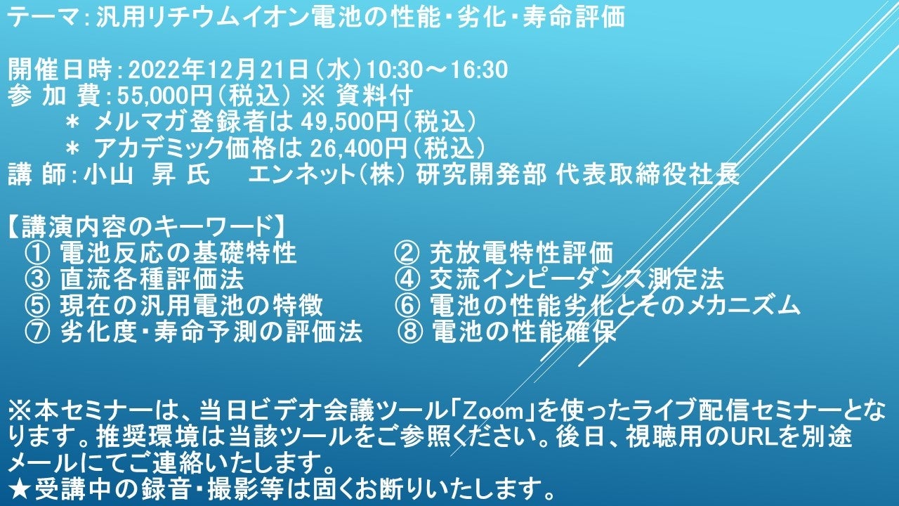 先端技術情報や市場情報を提供している(株)シーエムシー・リサーチ(千代田区神田錦町: https://cmcre.com/ )では、 各種材料・化学品などの市場動向・技術動向のセミナーや書籍発行を行っておりますが、 このたび「汎用リチウムイオン電池の性能・劣化・寿命評価」と題するセミナーを、 講師に小山 昇 氏 エンネット(株) 研究開発部 代表取締役社長)をお迎えし、2022年12月21日(水)10:30より、 ZOOMを利用したライブ配信で開催いたします。 受講料は、 一般:55,000円(税込)、 弊社メルマガ会員:49,500円(税込)、 アカデミック価格は26,400円(税込)となっております(資料付)。
