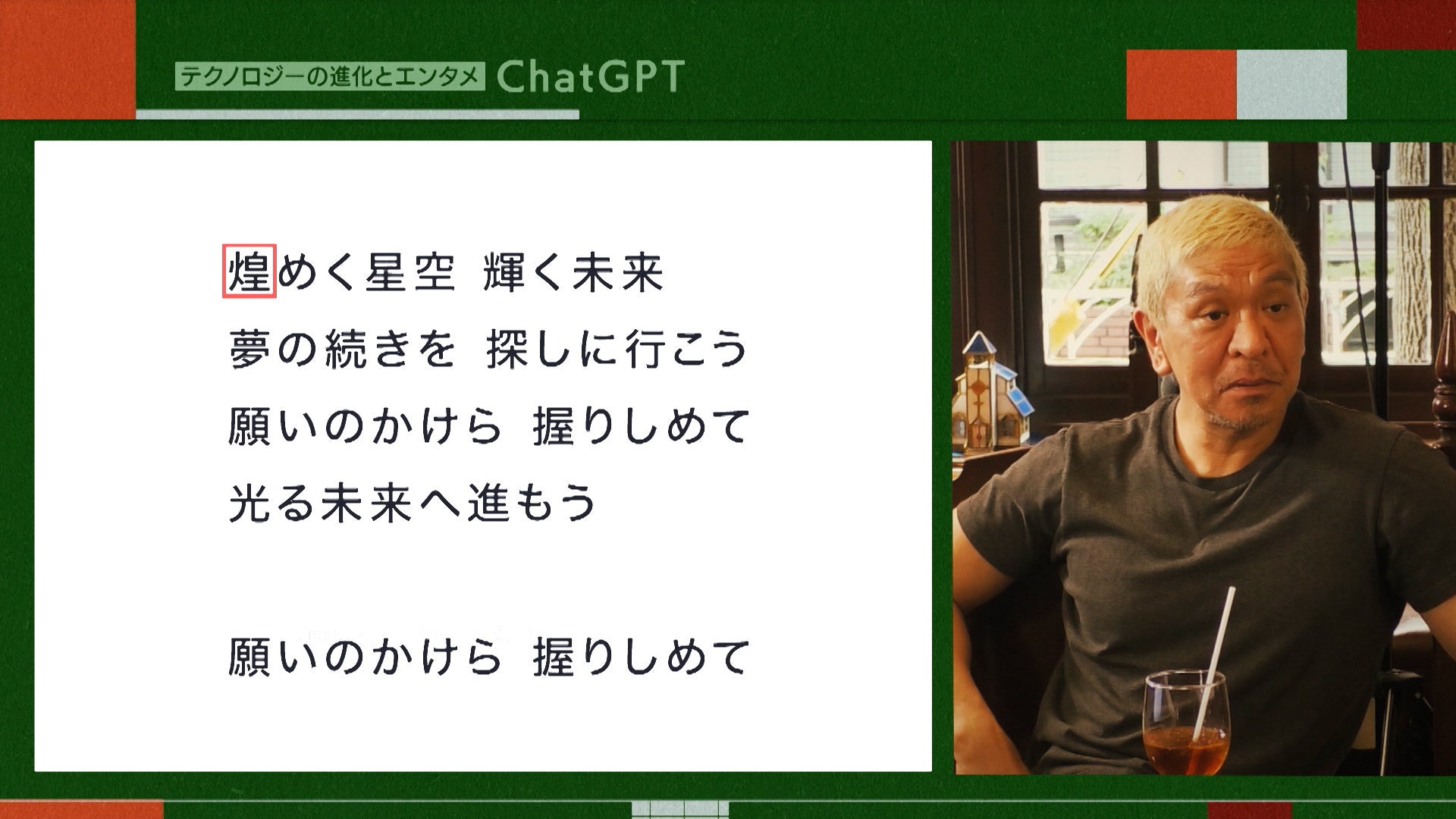 このほか、巷で話題のチャットGPTも紹介。「J-POPの歌を作詞して」とお願いすると、違和感のない歌詞が出来上がりました。増井さんは「新しいものを否定するつもりはない」と前置きしたうえで「僕たちが作ってきた文化って、必ず(先人からの)バトンが渡ってきたんだけど、この仕組みってバトンはどうすんだっけ? ってところも考えなきゃいけない」と危惧します。
