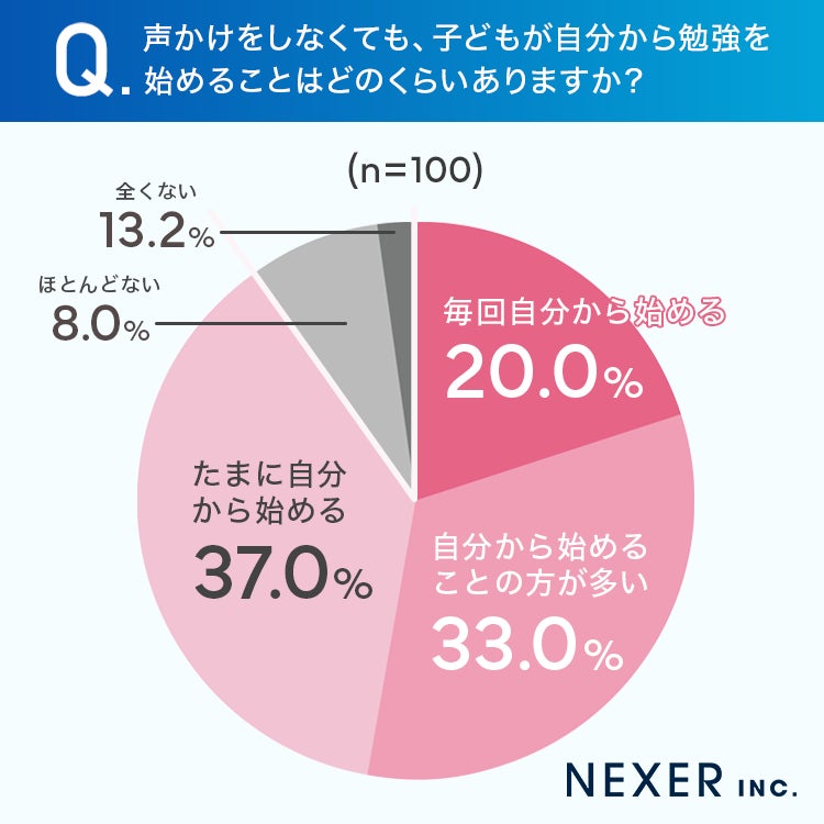 「毎回自分から始める」が20%、「自分から始めることの方が多い」が33%、「たまに自分から始める」が37%となり、合わせて90%の保護者が「子どもが自分から勉強を始めることがある」と回答しています。