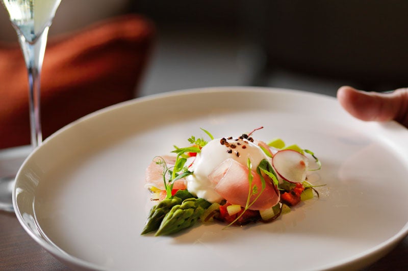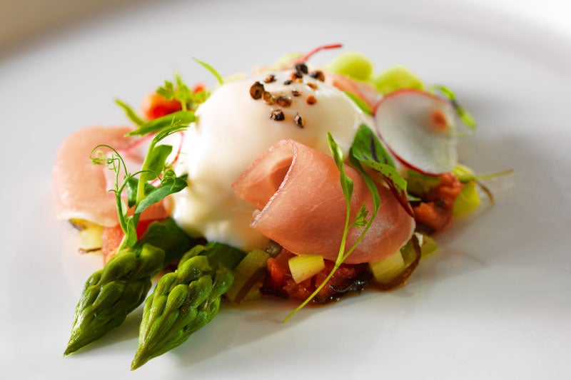 茹で上げアスパラガスとドライトマト、燻したマヨネーズを纏ったケージフリーエッグのポーチ、北海道生ハムを添えてご提供いたします。