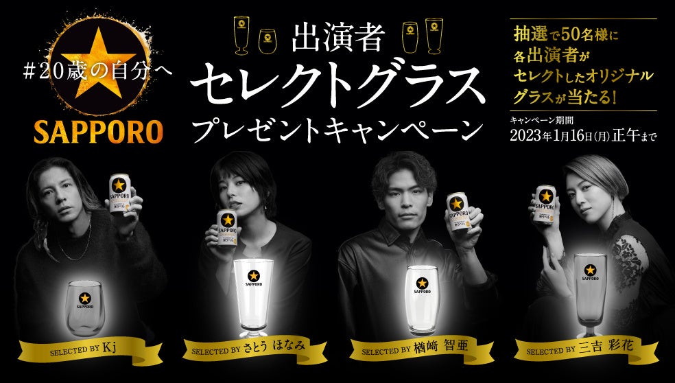 キャンペーン期間中にサッポロビール公式Twitterアカウント(@SapporoBeer)から投稿されるキャンペーン投稿をフォロー&リツイートすると、抽選で50名様に「#20歳の自分へ」スペシャルインタビュー企画出演の4名がそれぞれセレクトしたオリジナルグラスが当たります。