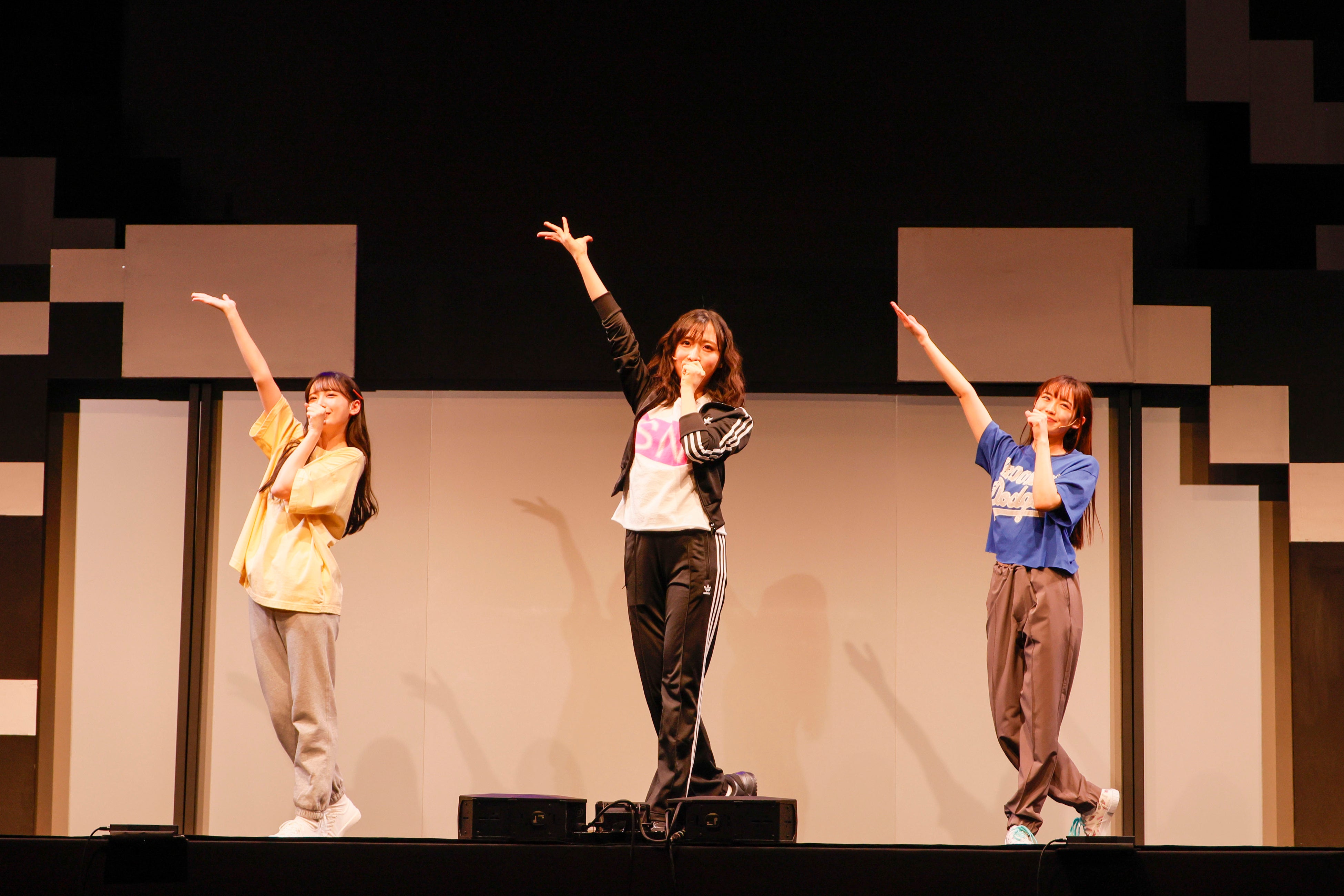 ゲネプロ後、囲み取材に小栗有以、濱岸ひより、鈴木瞳美が応じた。小栗は「二階堂ルイはアイドルを目指す女の子なんですけど、クールで真面目で周りを寄せ付けず、ツンケンしています。でも、お笑い芸人の馬場さんやミステリーキッスのメンバーと仲良くなって、段々と可愛さが見えてきます。実は弱いところもあったりするんですけど、今回の舞台はミステリーキッスがメインなので、二階堂の可愛らしさが詰まった舞台になってるんじゃないかなって思います」と演じる役に絡めた見どころを語った。そして、「これまでに『マジムリ学園』とかグループ内の舞台は出たことがあったんですけど、(グループ)外の舞台は今回が初めてです。この舞台を通して、新しい学びがありつつ、共演者の皆さんとも仲良くなれて、私的にも、二階堂的にも大きな舞台になっています」と、共演者から刺激を受けたと話した。