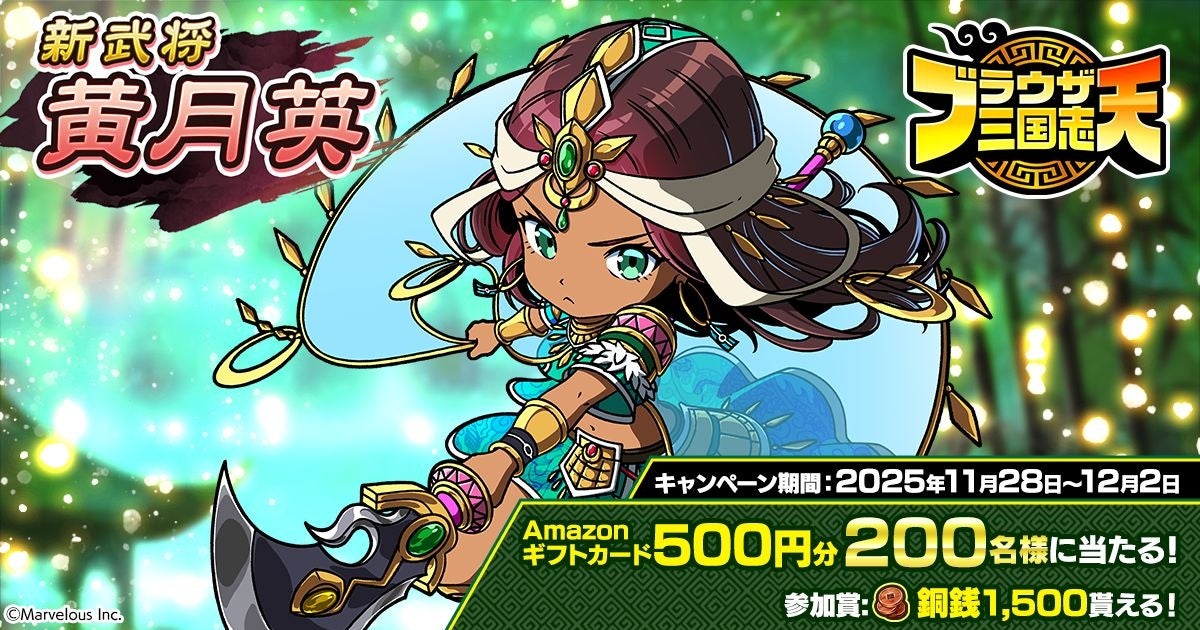 株式会社マーベラス(代表取締役社長:照井 慎一/所在地:東京都品川区)は、スマートフォンアプリゲーム『ブラウザ三国志 天』(略称:ブラ天)にて2025年11月28日(金)に「新武将《黄月英》登場ガチャ」を開始したことをお知らせいたします。