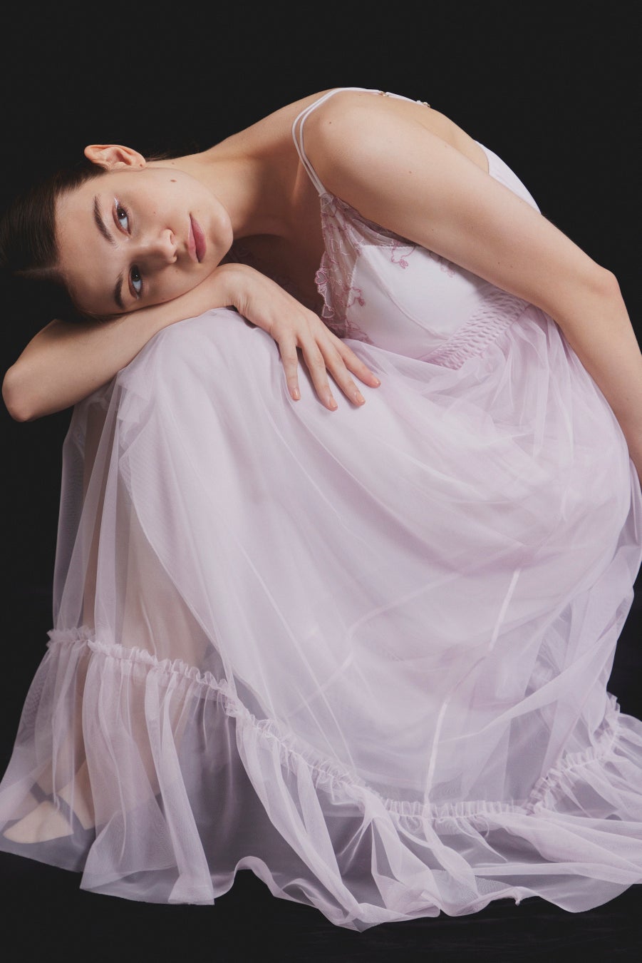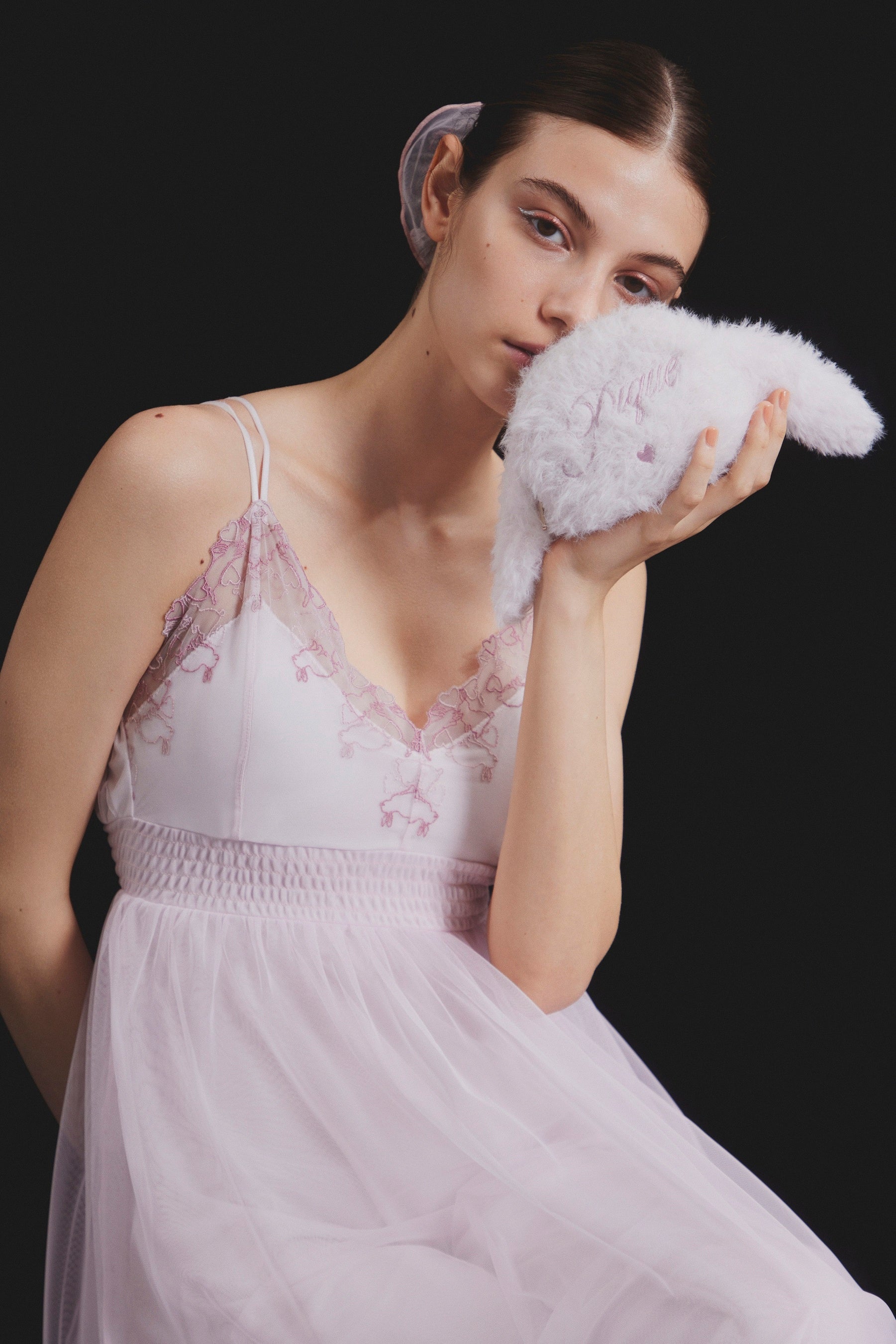 バニーとハートの刺繍が交互に並ぶオリジナルレースを使用したチュールワンピース。裾に向けてボリューム感のあるデザインが華やかな印象に。とびきりガーリーなピンクと、ちょっぴりクールなダークグレーがラインアップ。
