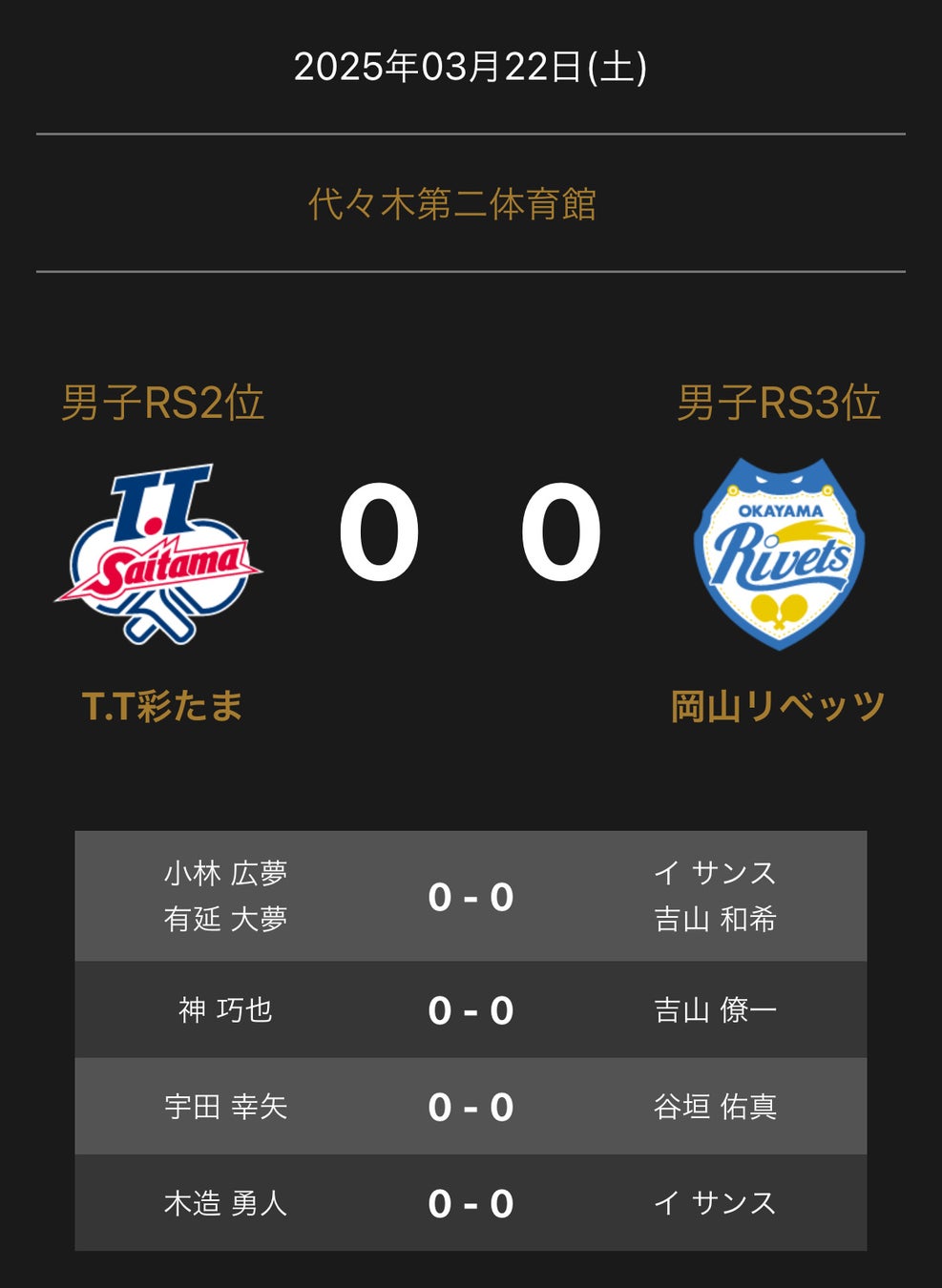 ノジマTリーグ 2024-2025シーズン 公式戦 3月21日開催 男子セミファイナル T.T彩たま vs 岡山リベッツ 対戦オーダー発表