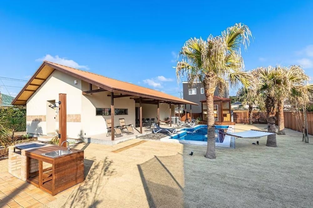 220坪の敷地にアジアンテイストの平屋に、10×3メートルのプール、ロウリュウサウナ、ジャグジー、BBQスペースなど贅沢な設備を備え、ペットと一緒に泊まれる一棟貸切宿です。海を眺めながらで極上の休日をお過ごしください。