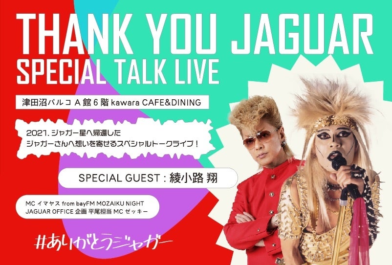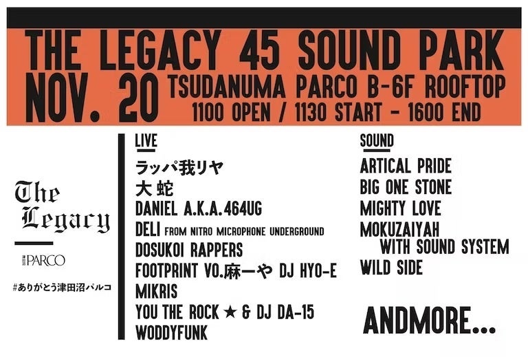 「THE LEGACY」は、津田沼PARCOの最後を一緒に盛り上げるため、ゆかりのあるゲストとして綾小路 翔をスペシャルゲストに迎え、2021年突如ジャガー星に帰還した千葉の伝説のロックスター「ジャガーさん」を語る「THANK YOU JAGUAR SPECIAL TALK LIVE」やDELI from NITRO MICROPHONE UNDERGROUND・ラッパ我リヤなどの千葉を代表するアーティスト、サウンドマンが集結し、津田沼パルコの屋上でLIVEを開催する「The Legacy 45 SOUND PARK」など豪華イベントがラインナップいたします。