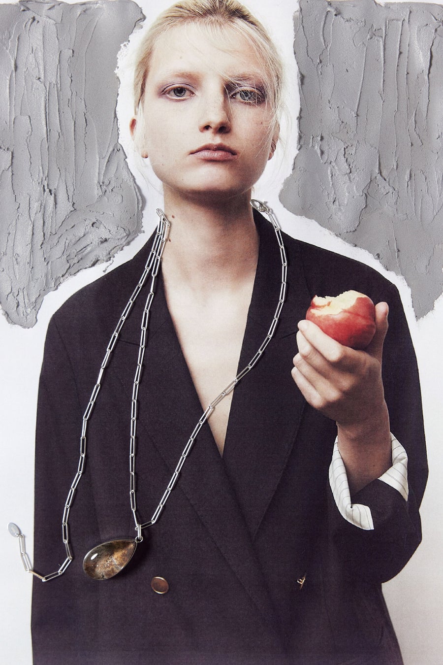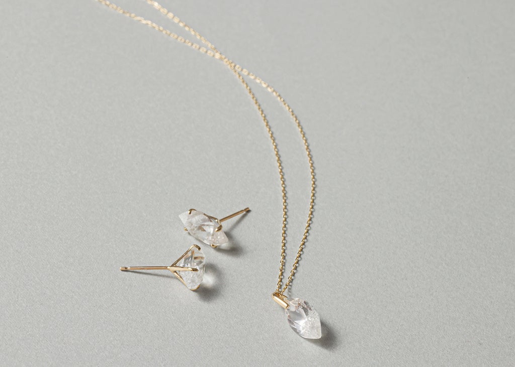 女性宝石研磨士・大城かん奈さんの代表作のひとつである「クラッシュクォーツ」を使用し、ネックレスとピアスに仕立てました。繊細な輝きと力強い存在感を併せ持つクラッシュクォーツが、日常に特別なきらめきを添えてくれます。